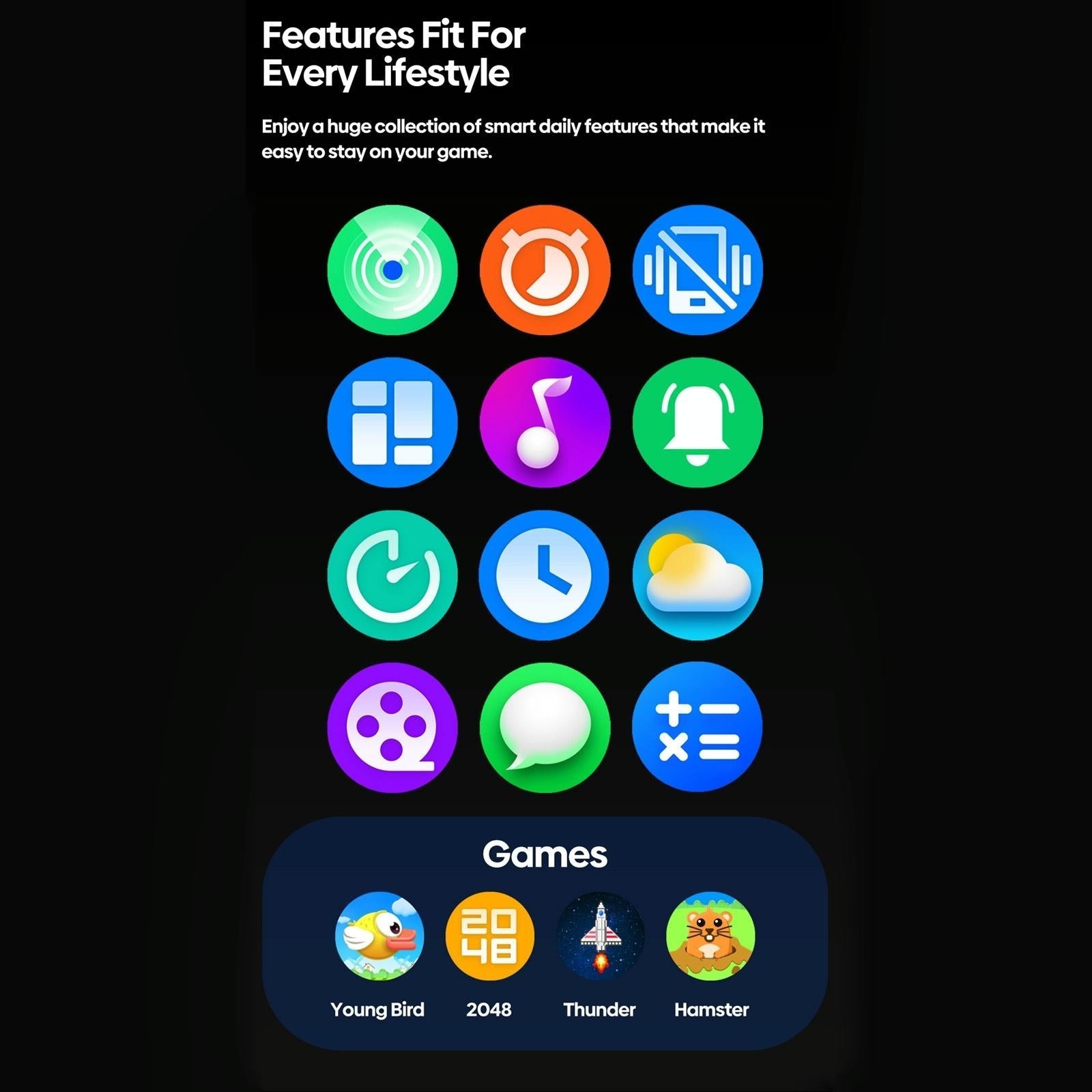 • Wrist-based Heart Rate (Constant, Every Minute), Daily Resting Heart Rate, SpO2(Blood Oxygen) Level Measurement, Blood Pressure, Breathing Training, Cycle Tracking, Sleep Score and Insights, Calorie Burn Tracking Health Monitoring