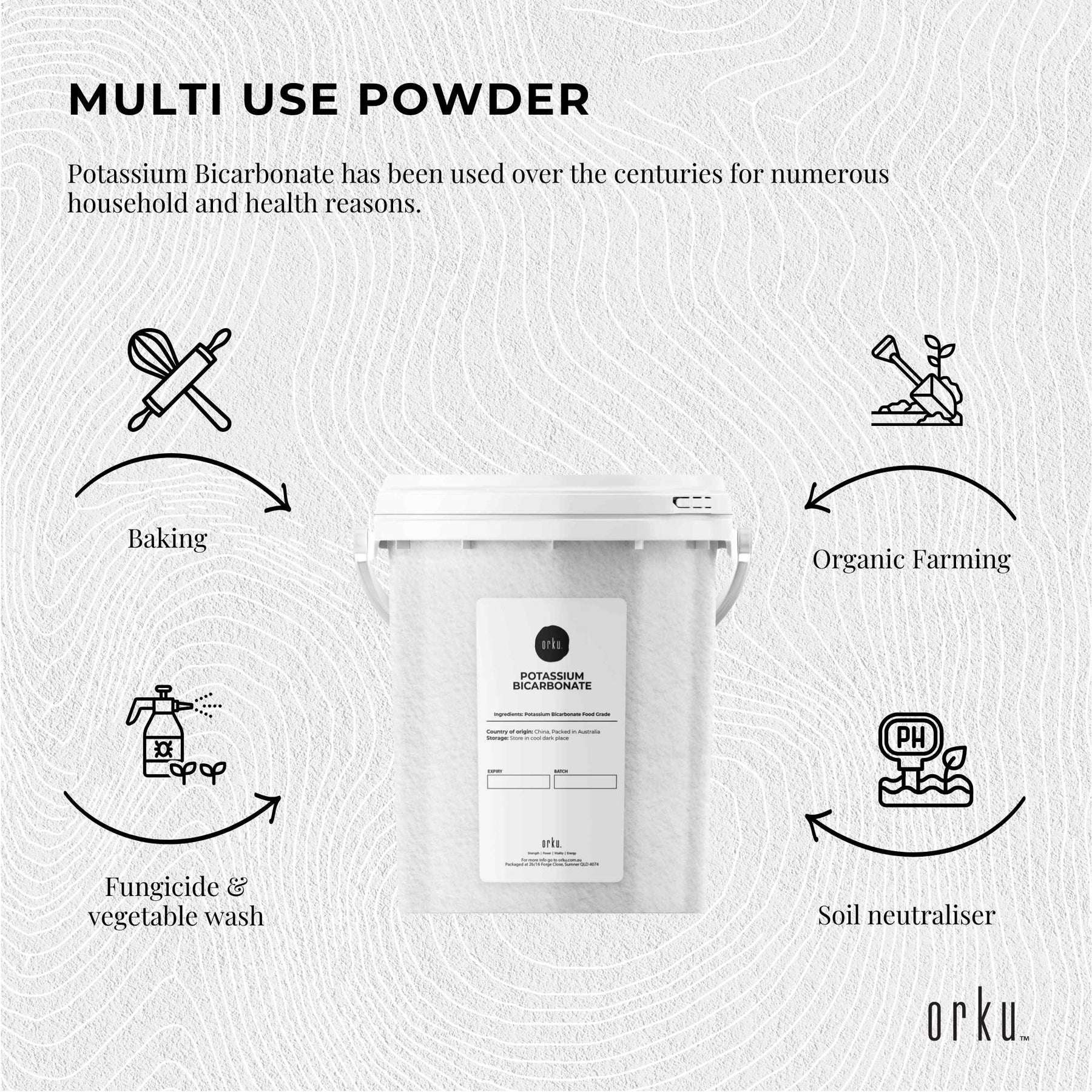Potassium Bicarbonate is used widely in agriculture as a soil neutraliser due to its basic nature and low toxicity. The powder is dissolved in water and the solution is then applied to the soil to increase the pH level.