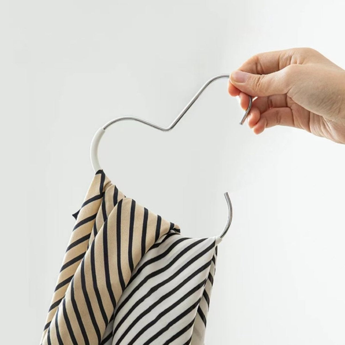 SCARF/BELT HANGERS: The pack contains 10 scarf hangers. Each hanger will keep at least 8 scarves, ties, belts, or shawls neatly stored in loops for your wardrobe, preventing them from snagging. A must-have if scarves are ruling your life and creating chaos in your wardrobe. VISIBLE & ACCESSIBLE: Keep scarves visible and easily accessible. The scarves hang down for easy access. Ideal scarf hangers for the shop or your wardrobe to neatly store your ties, scarves, shawls, and belts. DURABLE AND NON-SLIP DESIGN: Unlike other plastic holders, our scarf hangers are made of durable STEEL for long-lasting durability. These scarf hanger rings are 14cm (W) x 15cm (H), hook opening: 4cm. No more trying to cram your scarves through a small hole, causing wrinkles. NO EQUIPMENT NEEDED: If you want something easy to use, that makes it easy to find the scarf you want, and that fits well in your wardrobe, this scarf organizer will meet all your needs. Hang it on a clothes rail or hook, and all your scarves will be neatly folded and easy to see, so you can easily choose which one to wear. MULTIFUNCTIONAL SCARF ORGANIZER: Although designed for scarves, this hanger also makes a great organizer for ties, belts, and other accessories. These scarf hangers will keep your accessories neat, visible, and clean. Show more