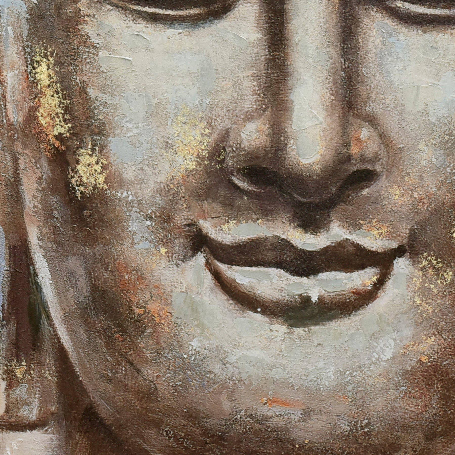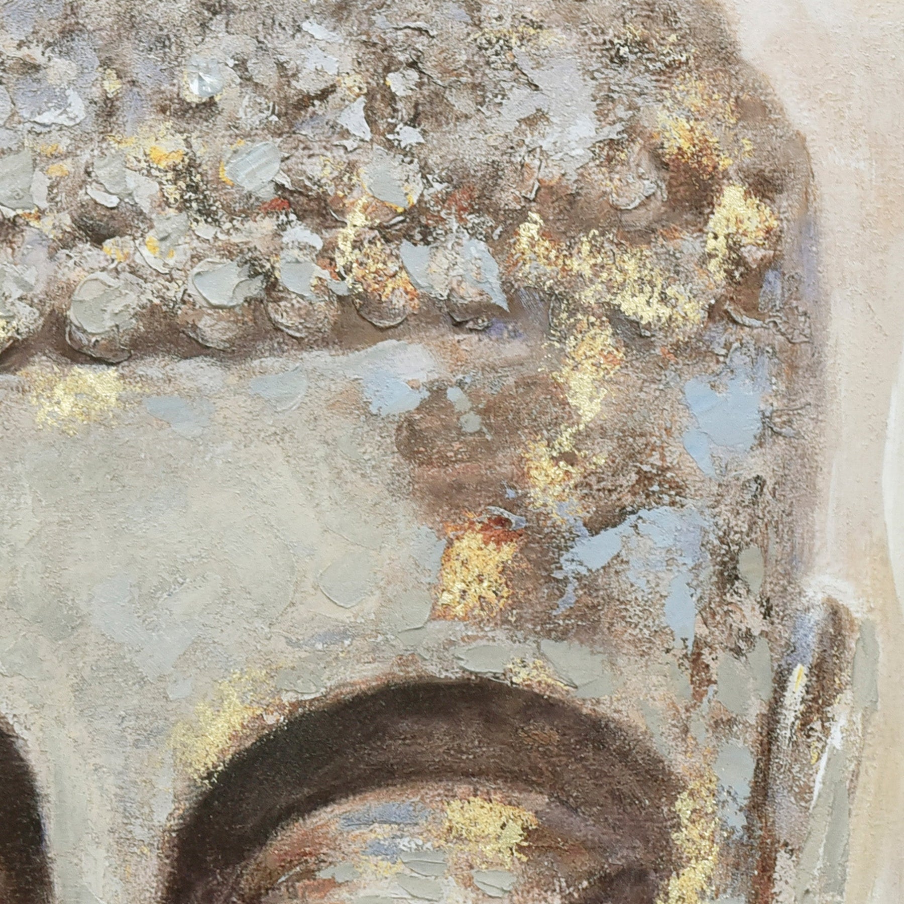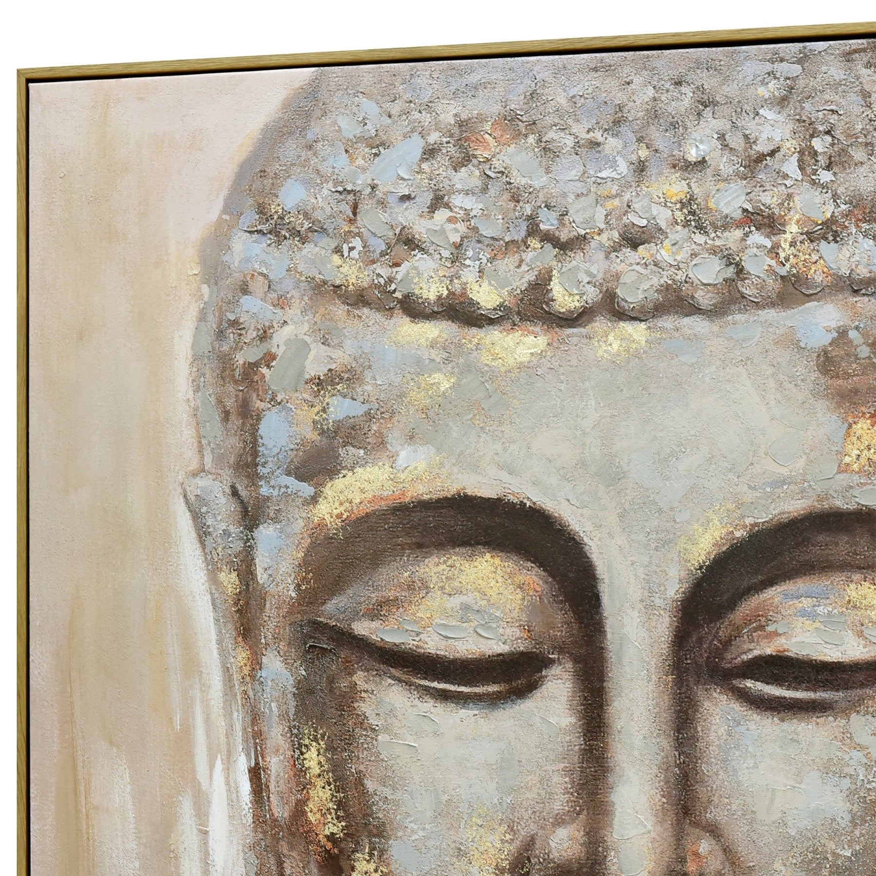"Mystic Mettle" transports the viewer to a realm where spirituality meets the tangible. At the canvas's heart is the face of Buddha, rendered in evocative shades of earthiness, symbolizing the strength and endurance of the enlightened one's teachings. The closed eyes reflect a depth of introspection and peace, drawing the viewer into a meditative trance. Subtle gold highlights dance across the visage, accentuating the contours and adding a luminous contrast to the earthly tones. This beautiful depiction, centered perfectly on the canvas, is framed elegantly in dark wood, enhancing the richness of the palette and the depth of the subject. Crafted with a harmonious blend of hand-painted and printed techniques, "Mystic Mettle" stands as a testament to the enduring allure of spiritual icons, beckoning viewers to reflect and find inner peace.