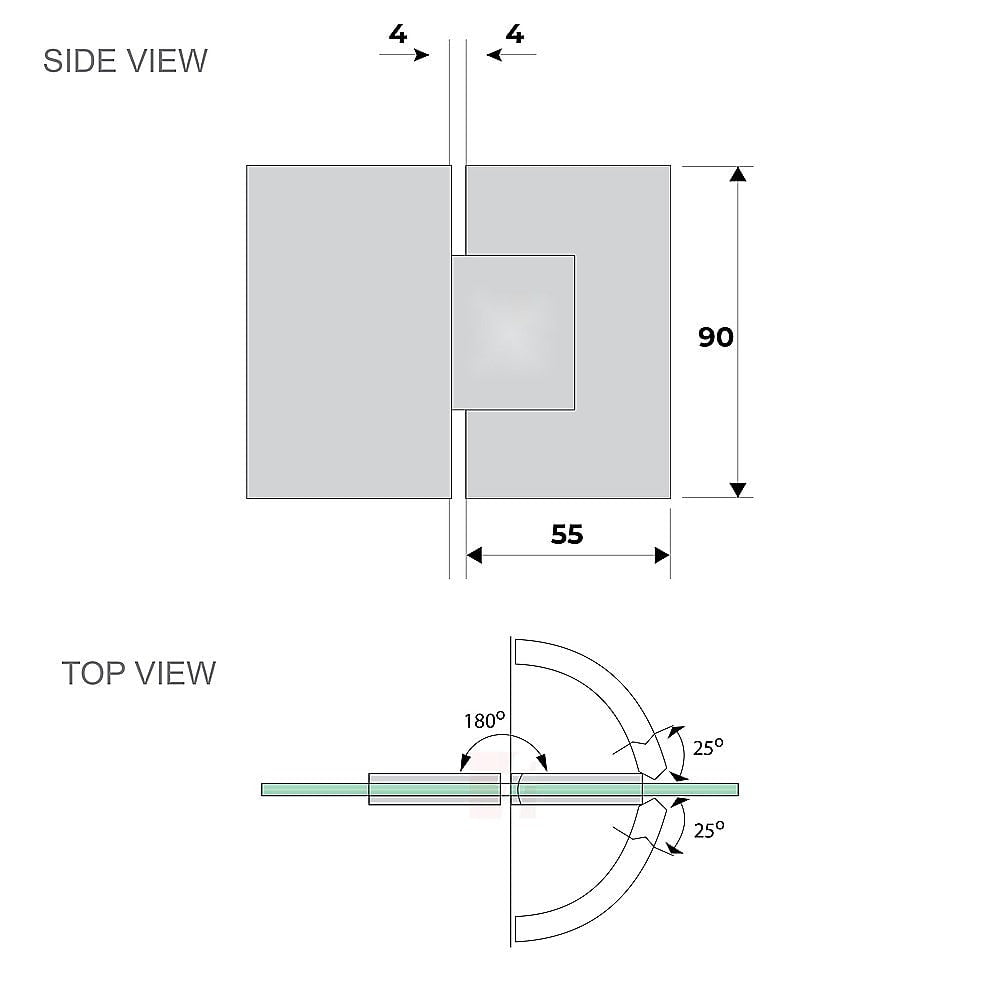 Crafted from stainless steel, the shower door hinge is built to accommodate 10mm toughened safety glass. It swings a full 90 degrees in both directions and automatically centers itself within 25 and will automatically close.