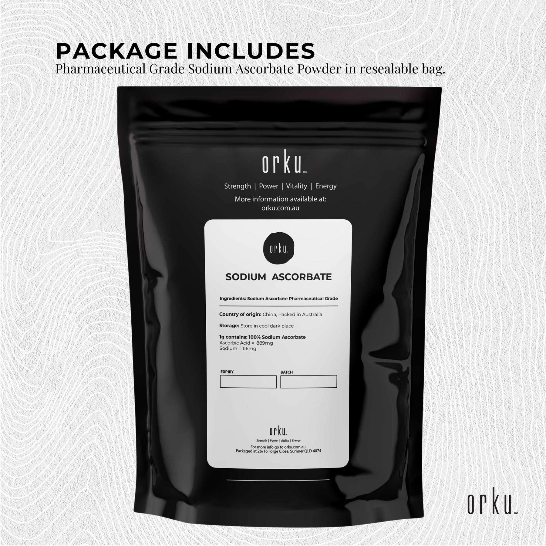 1kg Pharmaceutical Grade Sodium Ascorbate Powder in resealable bag.