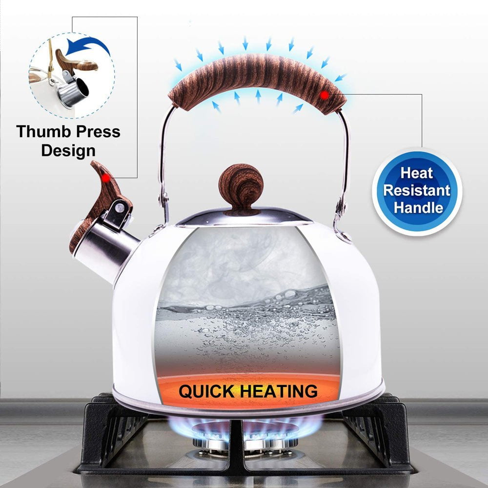 Large diameter spout design, can direct water injection, time saving, fast and safe design. Loud & automatic whistling catch your attention even in a noisy environment. When you focus on your housework, movies, music, or any other things, the teapot will remind you with a whistle after boiling water. To prevent you from forgetting to turn it off and drying the water up.