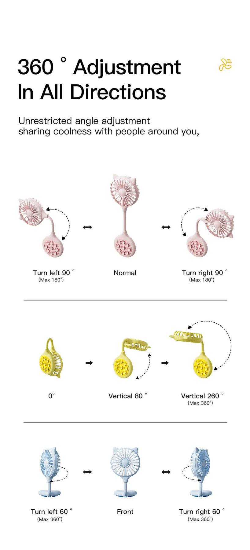 • 360-Degree Adjustable Design: Rotate and tilt the fan to any angle for personalized airflow.