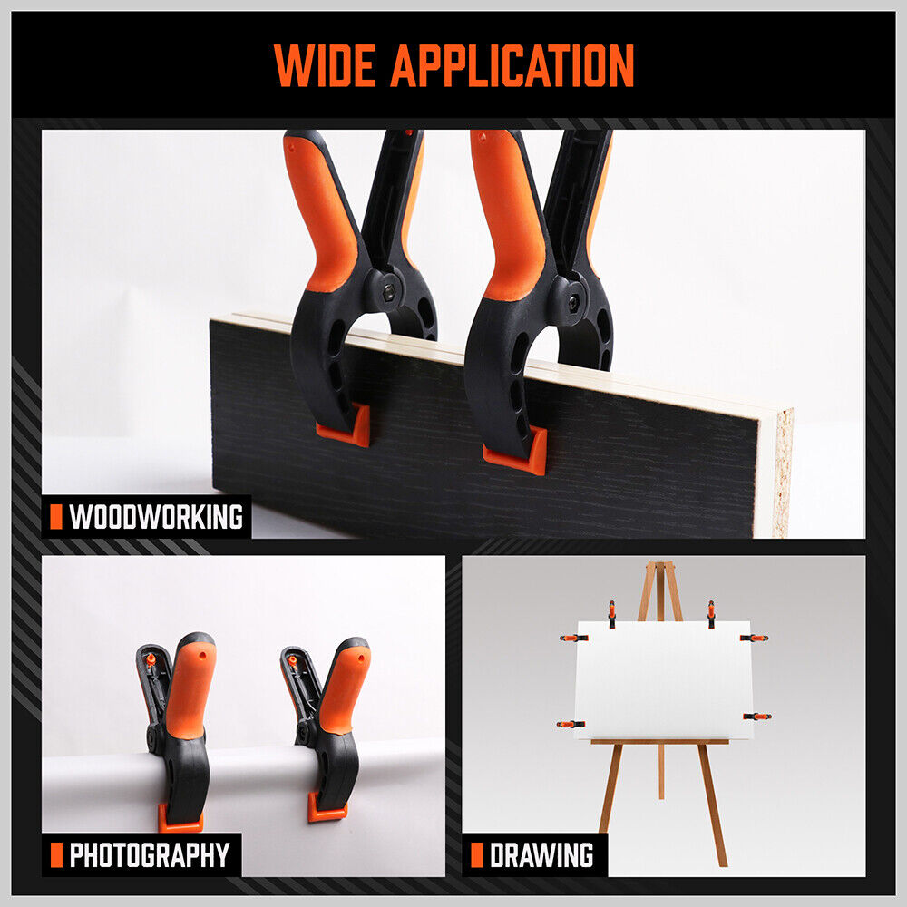 - 20-piece nylon spring clamp set with 3.5-inch clamps (x10), 4.3-inch clamps (x6), and 6.3-inch clamps (x4)