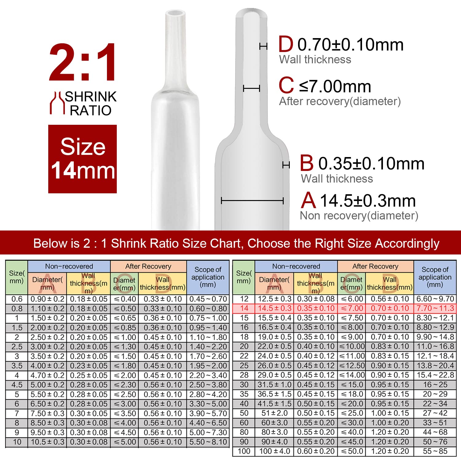 shrink to 1/2 of its original diameter and makes a tight seal, diameter 14mm, 2m in total length. please Check diameter chart.