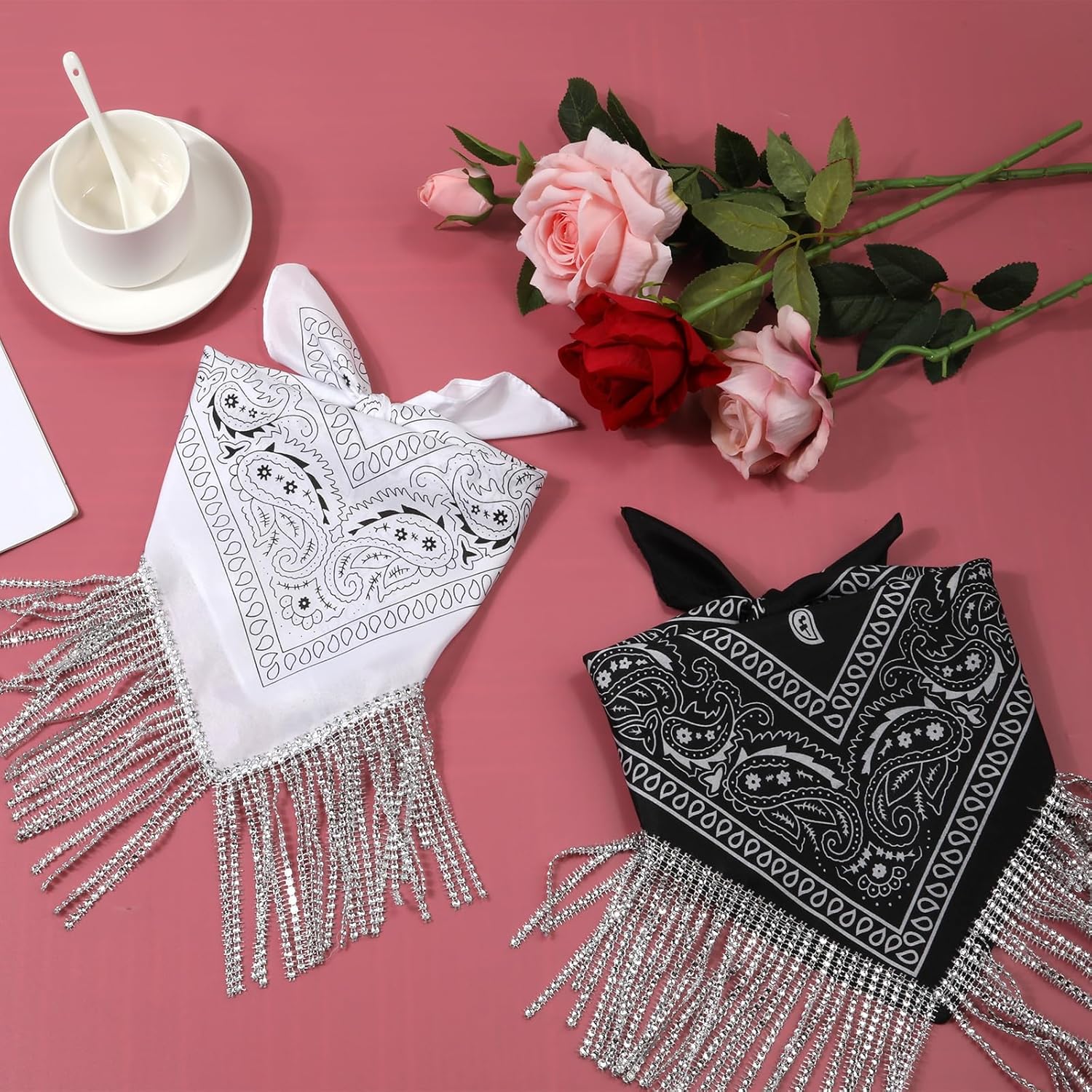 2pcs Rhinestone Fringe Bandana, Rhinestone Scarf for Women Sparkly Disco Cowgirl Bachelorette Bandanas Bling Bandanas Party Supplies for Men Women