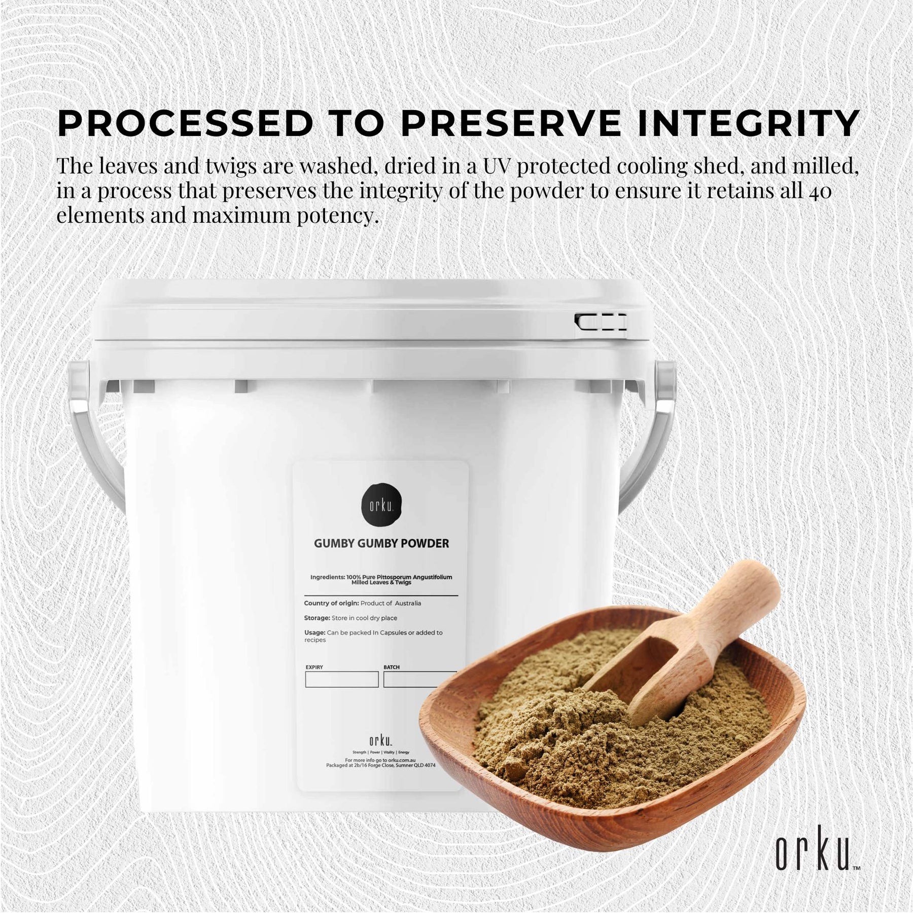 Orku Gumby Gumby (aka GumbyGumby) powder is made from hand selected leaves and green twigs of only the youngest shoots of healthy Gumby Gumby trees.