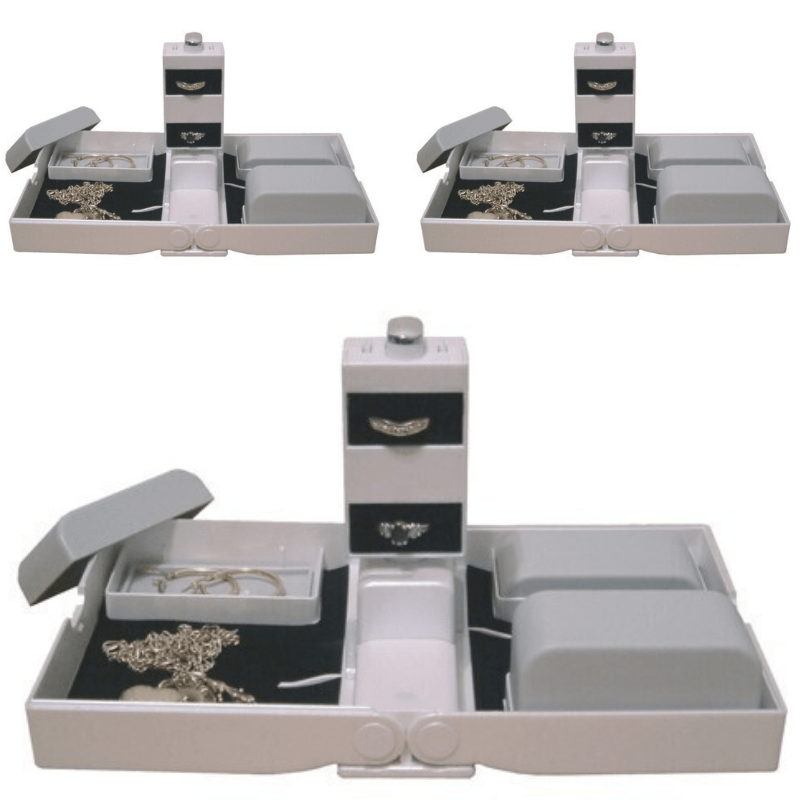 Hydraulic action jewellery holder. Unlock and push the chrome button and the case magically unfolds to reveal 3 compartments for necklace, earrings, etc and a central pillar for rings. Finished in a pearly white case with black velvet lining.