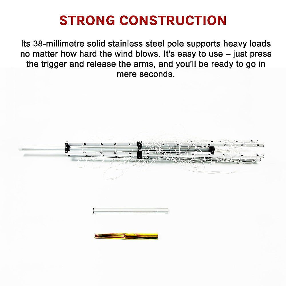 Its 38-millimetre solid stainless steel pole supports heavy loads no matter how hard the wind blows. It's easy to use just press the trigger and release the arms, and you'll be ready to go in mere seconds. When you're done, simply fold up the arms until the next time you do your laundry. It's easy to install and even comes with a ground spike, so you can get it up and running without a trip to the hardware store. With its mould-proof line, you'll never have to worry about mildewy laundry, even on humid days.