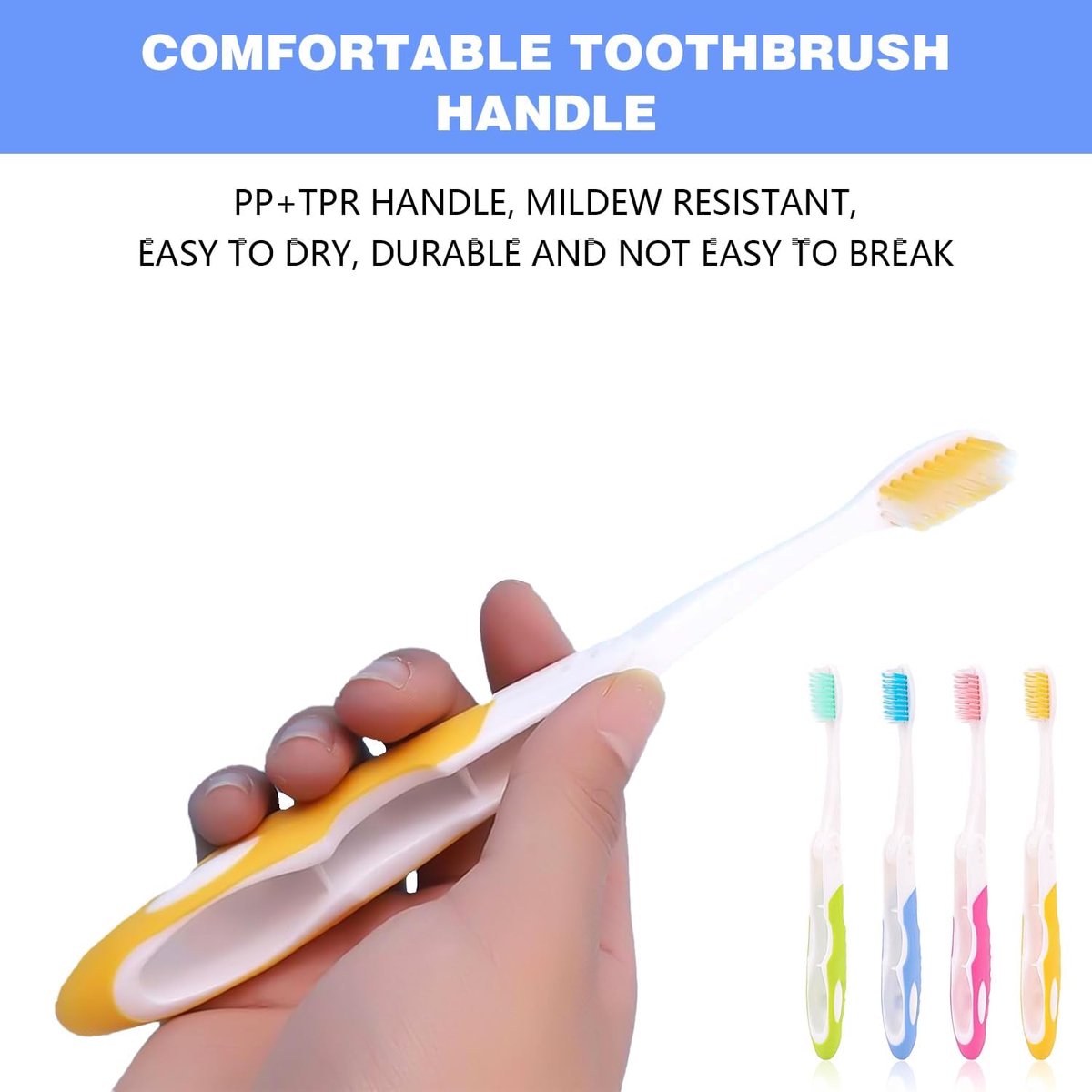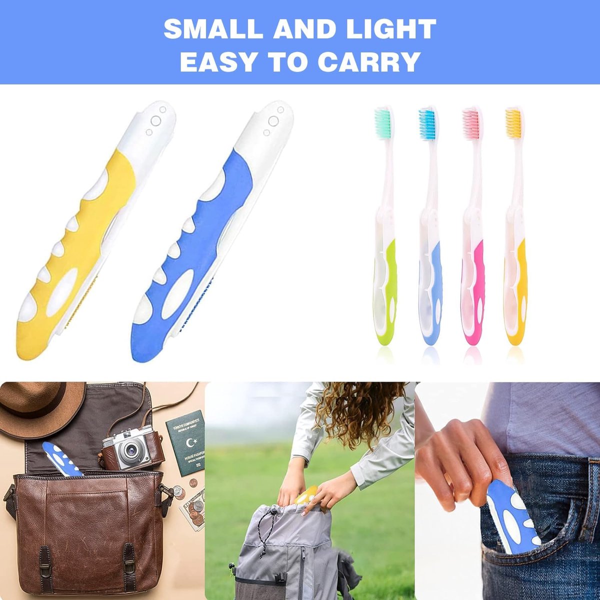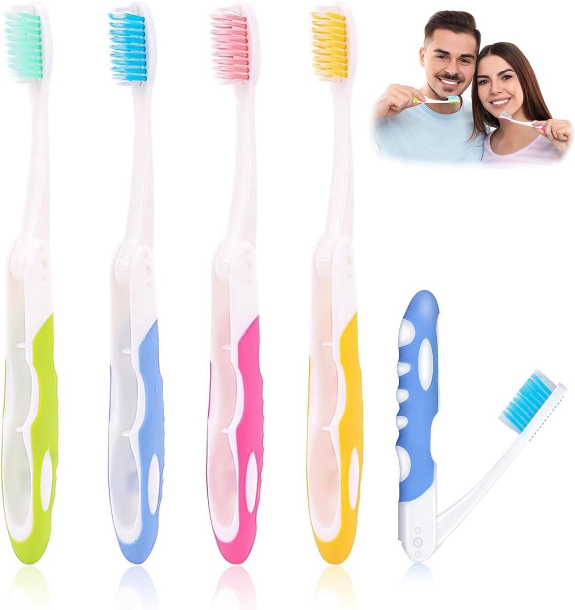What's in the Box: You'll receive four foldable toothbrushes in a variety of colors. They're large enough for home or business trips, and fit easily in your pocket, bag, and other belongings. High-Quality Materials: These foldable travel toothbrushes are made of high-quality materials and are odorless. The soft bristles are gentle on your mouth and reusable without leaving odors or damage. Travel Toothbrush Set: This toothbrush set features a comfortable grip and soft bristles for a gentle, deep brushing experience, making it easy to clean your teeth. They're easy to use, gentle on your mouth, and effective. Suitable for both adults and children.