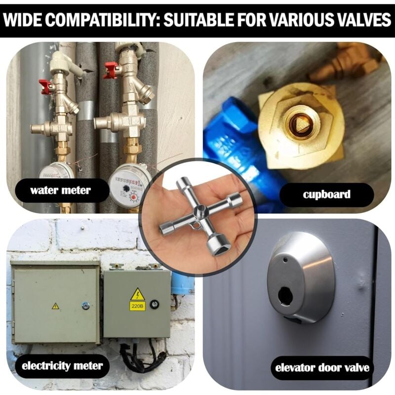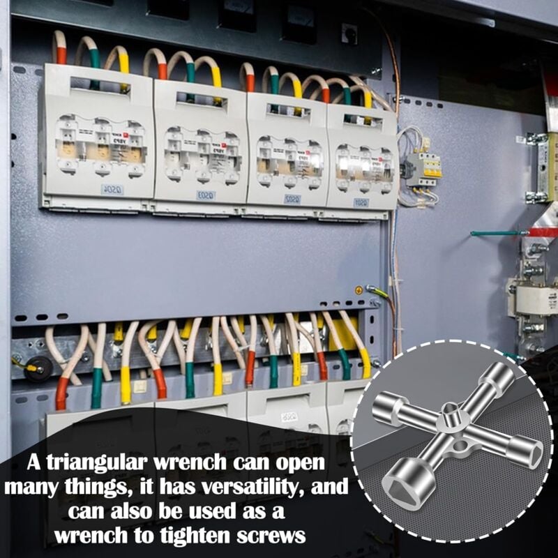 Product Features: Material: The electrical cabinet key is made of zinc alloy, strong and durable, not easy to break, has a long service life and can be used for a long time. 4-way 5 sizes: The triangle key has 5 triangular sizes. 5 inner triangle keys of different sizes can be used with 99% of the triangular locks, triangular valves and triangular screws on the market. It is functional and can be used according to size and shape. Widely used: The multi-function knobs can be used as a wrench to turn screws and are suitable for various valves such as electricity, water, gas, trains, cabinets and elevators. Multifunction: The water key can open many things, as long as it matches its size and shape, it is multifunctional and can also be used as a wrench to turn screws. Easy to carry: Suitable size, you can carry it with you or put it in your pocket. There is a hole in the middle of the key, which allows you to easily hang it on the key ring and carry it easily.