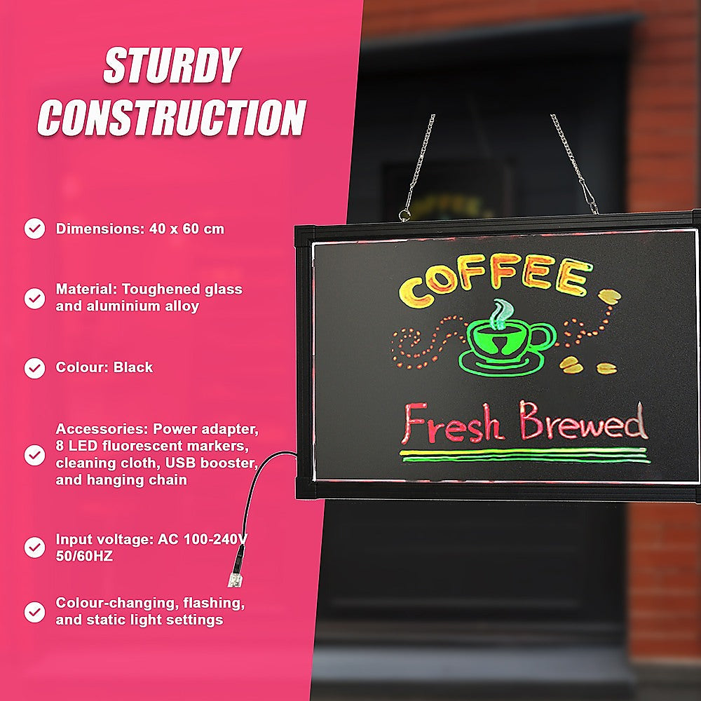 - Accessories: Power adapter, 8 LED fluorescent markers, cleaning cloth, USB booster, and hanging chain