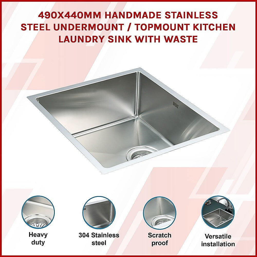This single sink is made from 1.2mm-thick Type 304 stainless steel with a satin finish for a brilliant look that will last and last. It measures 490 x 440 x 205mm (L x W x D) with a 90mm drain opening. A strainer waste is included. Installation is Undermount / Topmount-style.