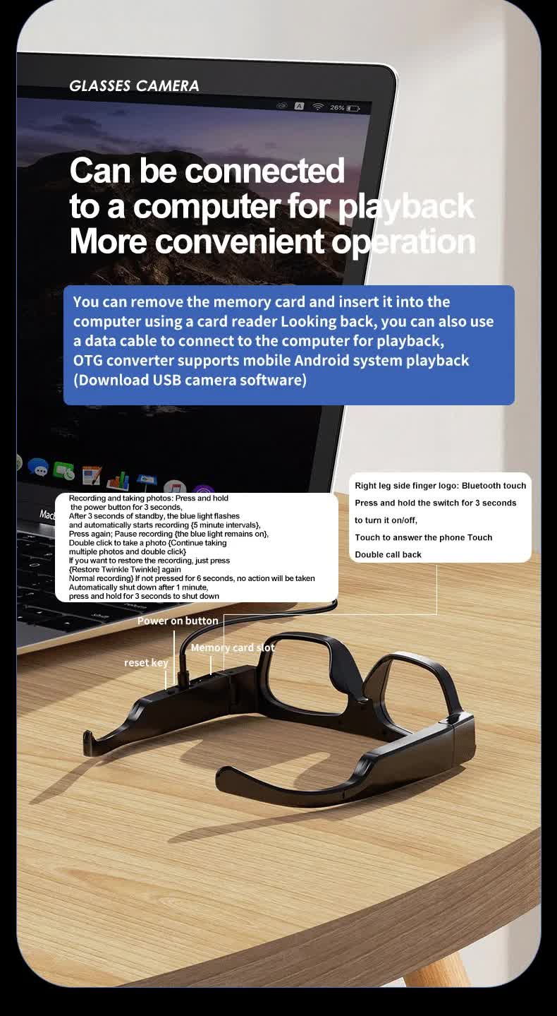 Revolutionize the way you capture and experience the world with these 4K smart Bluetooth glasses. Equipped with a high-definition camera, Bluetooth connectivity, and 64GB of built-in storage, these multifunctional glasses let you record videos, take photos, stream live, and stay connected on the go. Perfect for everyday use, sports, driving, and live streaming!
