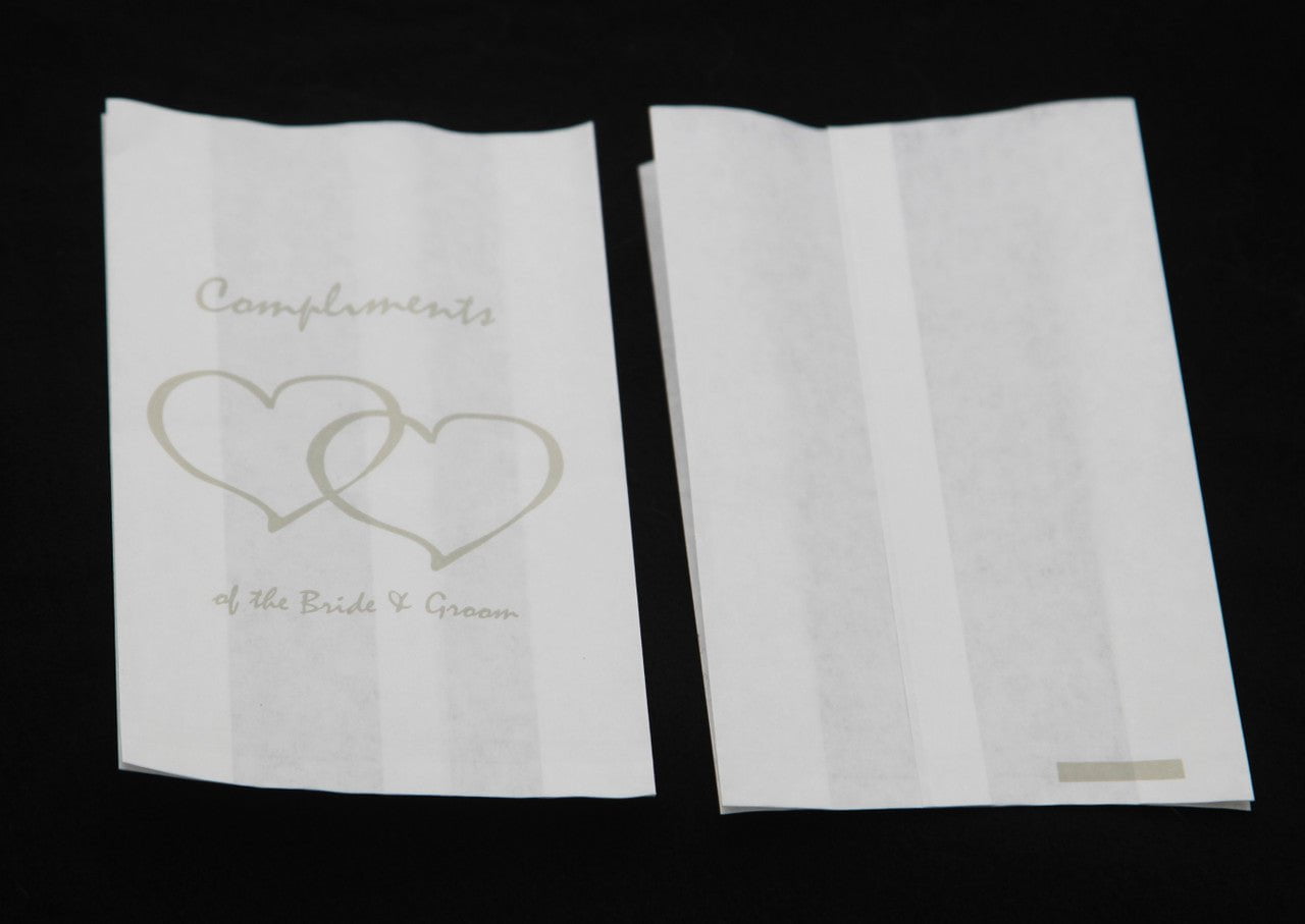 This pack includes 50 greaseproof wax paper bags, each adorned with an elegant heart design that complements a variety of wedding themes. Measuring 8 cm x 15 cm, these bags are the perfect size for packaging individual slices of your wedding cake.