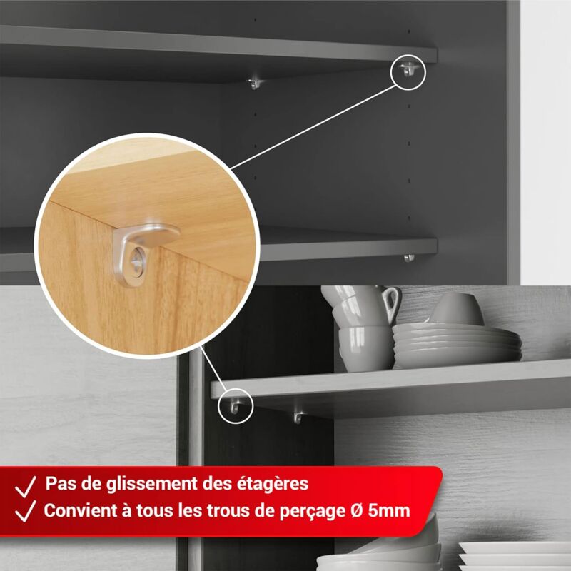 The two pins of the shelf bracket prevent the shelves from slipping and fix the cabinet brackets securely in the cabinet walls.