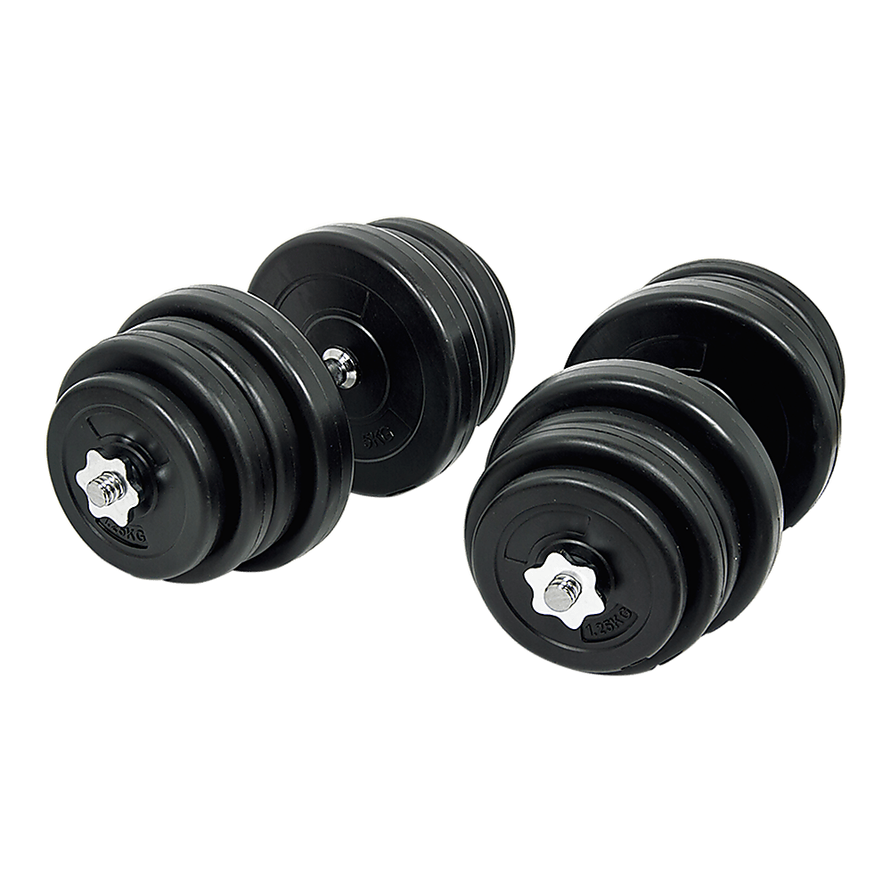 The set comes with twelve plastic-coated cement plates in small increments, so you can increase your load gradually as you build your strength. Star-shaped nuts made from high-quality steel keep the weights in place for easy lifting.