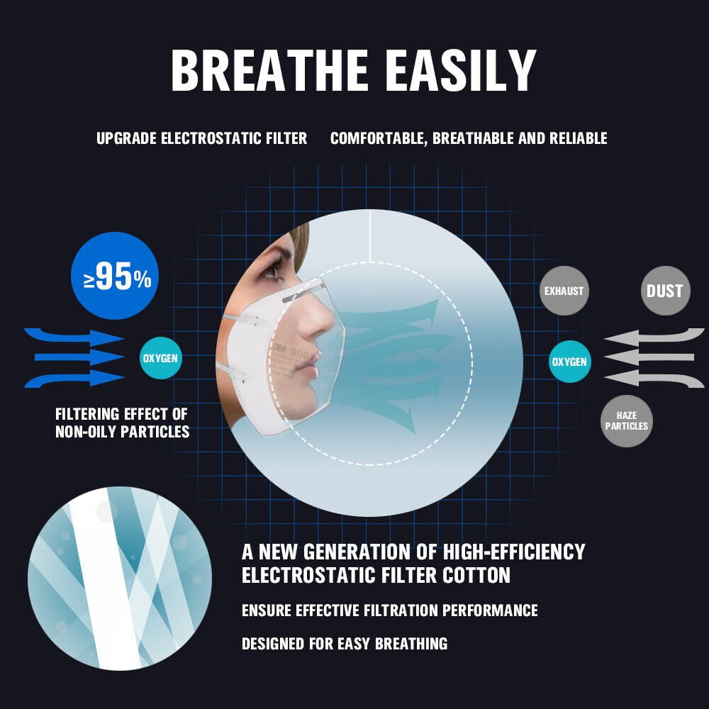 - Advanced electrostatically charged microfiber filter media designed for ease of breathing and can prevent dust, car exhaust, pollen, etc.