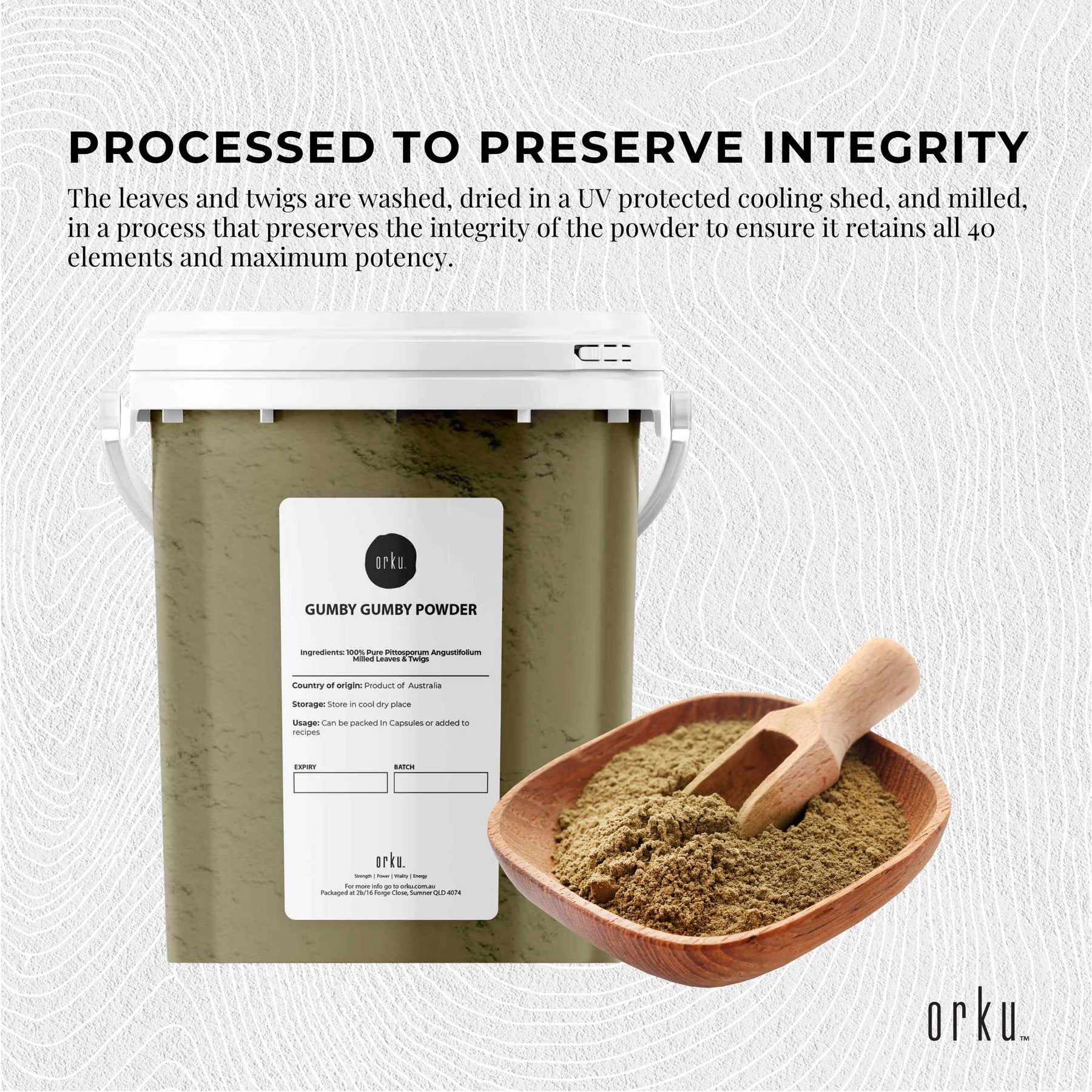 Orku Gumby Gumby (aka GumbyGumby) powder is made from hand selected leaves and green twigs of only the youngest shoots of healthy Gumby Gumby trees.