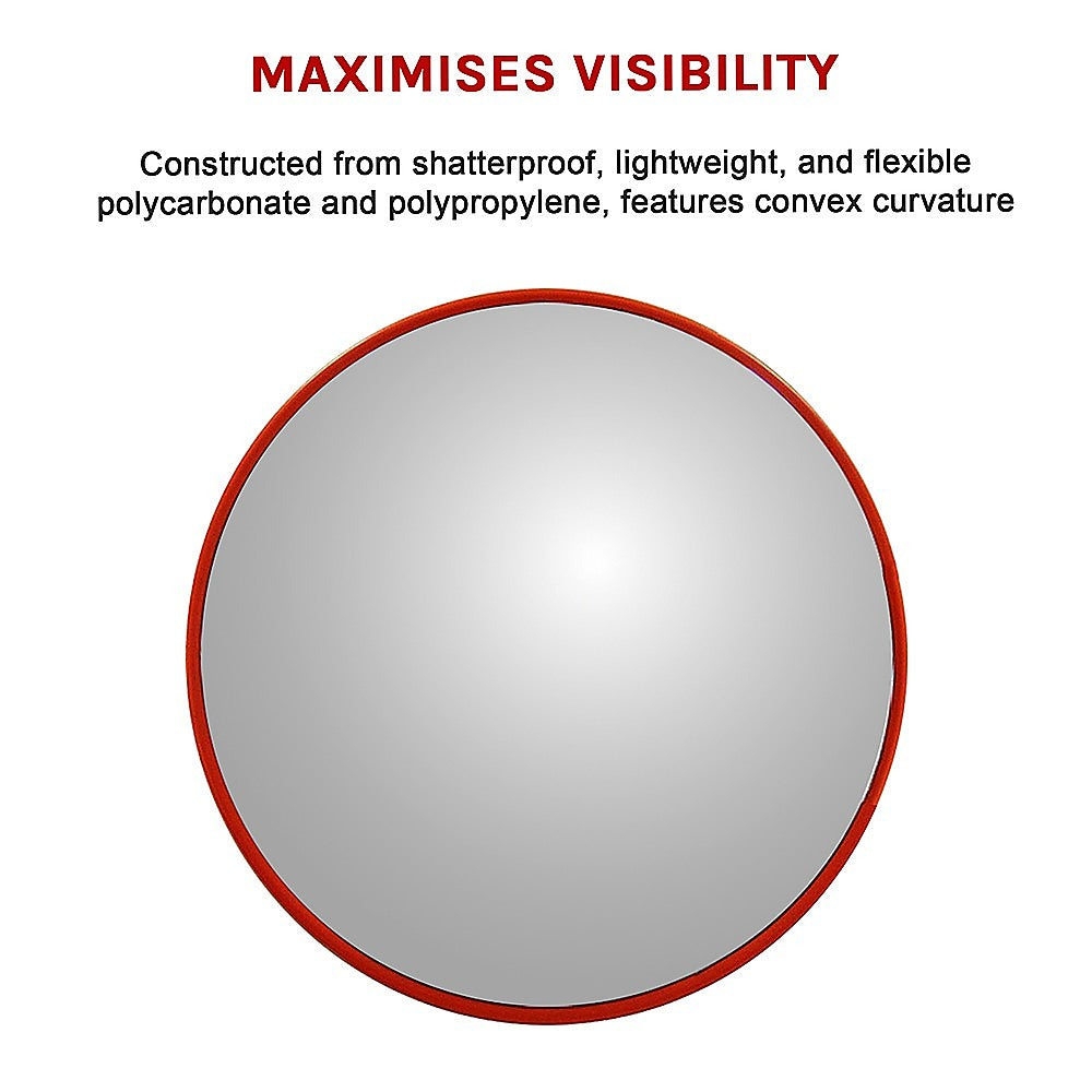 This 60-centimetre wide-angle convex road safety mirror from Randy & Travis Machinery provides motorists and pedestrians with better vision. With convex curvature, the mirror reduces or eliminates blind spots, allows drivers to better gage tight spots and corners in parking garages, driveways, or narrow streets. With eye-catching orange-red colour, drivers can receive advanced warning of hazards ahead, while its two-metre viewing distance gives drivers room to manoeuvre around the hazard safely.
