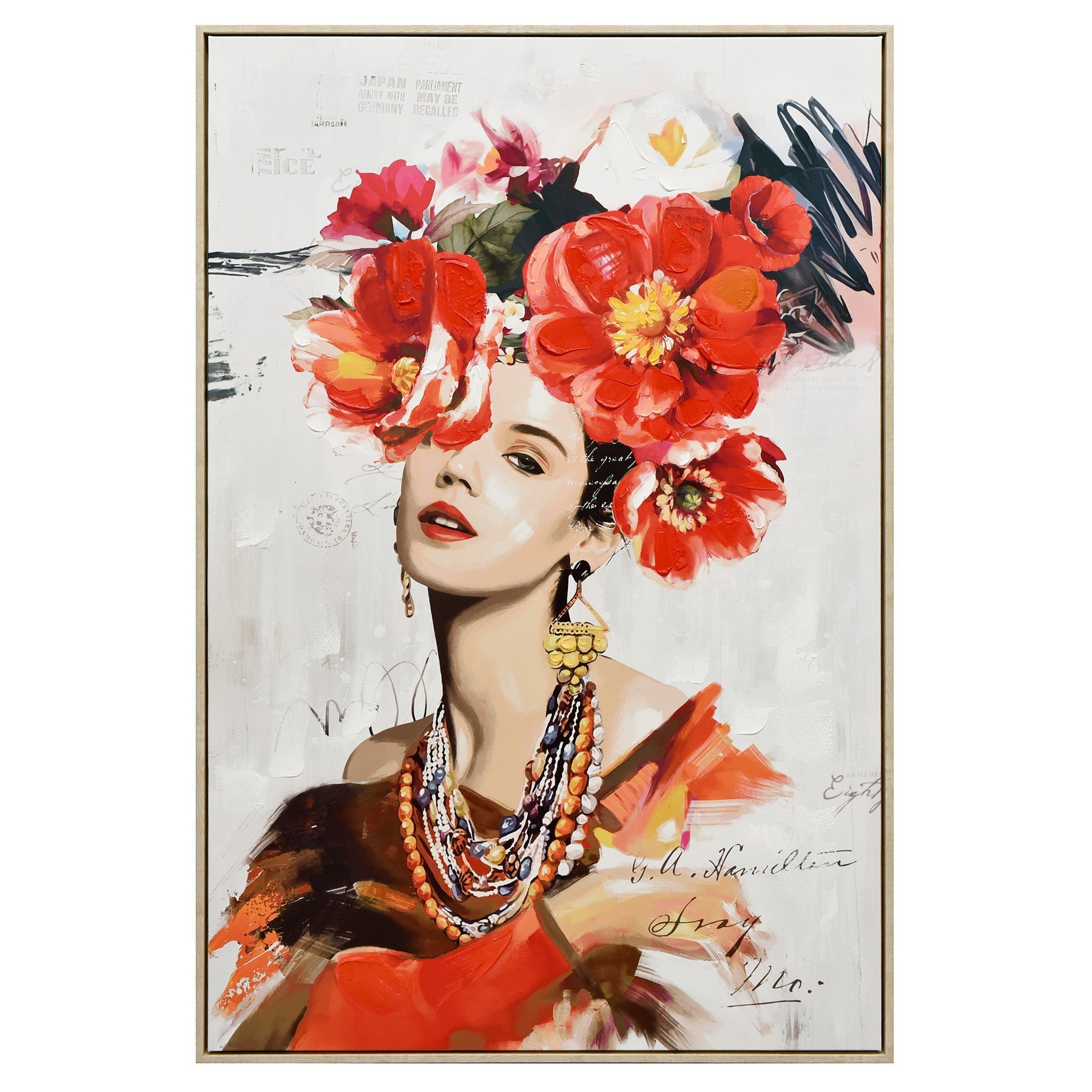 "Blossom Adorned" captivates with the sublime fusion of tradition and nature's beauty. At its center is the portrait of a woman, her lips painted with a striking shade of red, complementing her traditional outfit. The intricate beaded chains around her neck drape gracefully, showcasing her regal demeanor, while the large gold earrings add an aura of opulence. Yet, what truly elevates this piece to a realm of enchantment is her head, adorned not with hair, but a lush cascade of red and white flowers. One of these blossoms gently obscures her eye, adding a touch of mystery and allure. Crafted with a harmonious blend of hand-painted elements and print, the artwork is framed elegantly in light fir wood, creating a delicate balance between its vibrant and muted tones. "Blossom Adorned" is a testament to the timeless beauty of tradition, intertwined with the ethereal charm of nature.