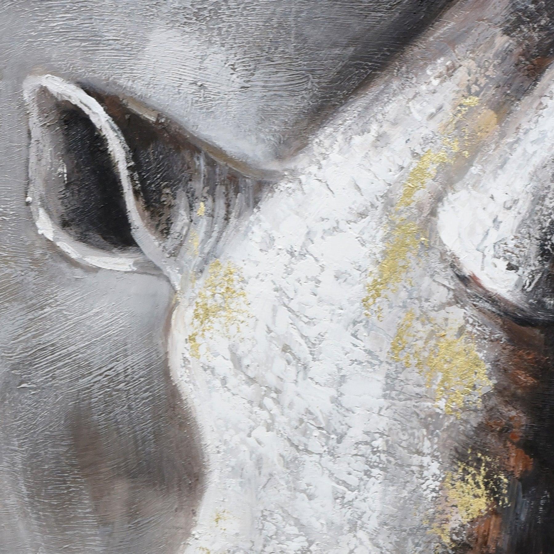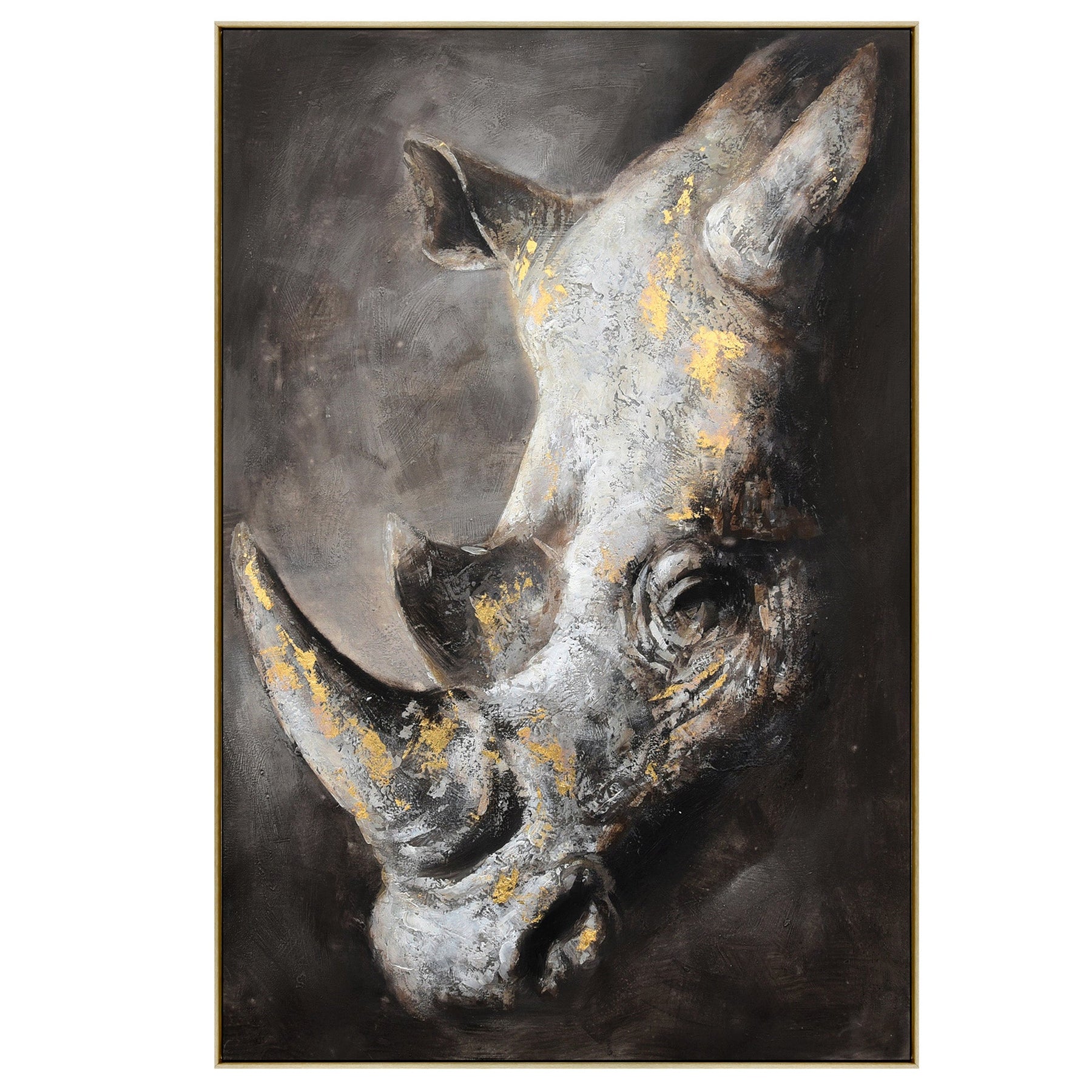 "Golden Titan" is a masterpiece that captures the raw strength and majesty of the rhino, one of nature's most formidable creatures. Set against a dark, almost enigmatic background, the rhino's head emerges, rendered in intricate detail. The grey tones, evocative of the animal's natural hue, are contrasted beautifully by gold highlights that accentuate its face and mighty horns, lending the piece an aura of opulence. The smoky darkness from which the rhino appears further emphasizes its dominance, as if it's emerging from the very essence of the wild. Every stroke on this 100% hand-painted canvas is meticulously crafted, showcasing the artist's commitment to capturing the creature's spirit. Framed elegantly in champagne-hued wood, "Golden Titan" is not just an artwork; it's a tribute to the wild, the majestic, and the unparalleled beauty of nature.
