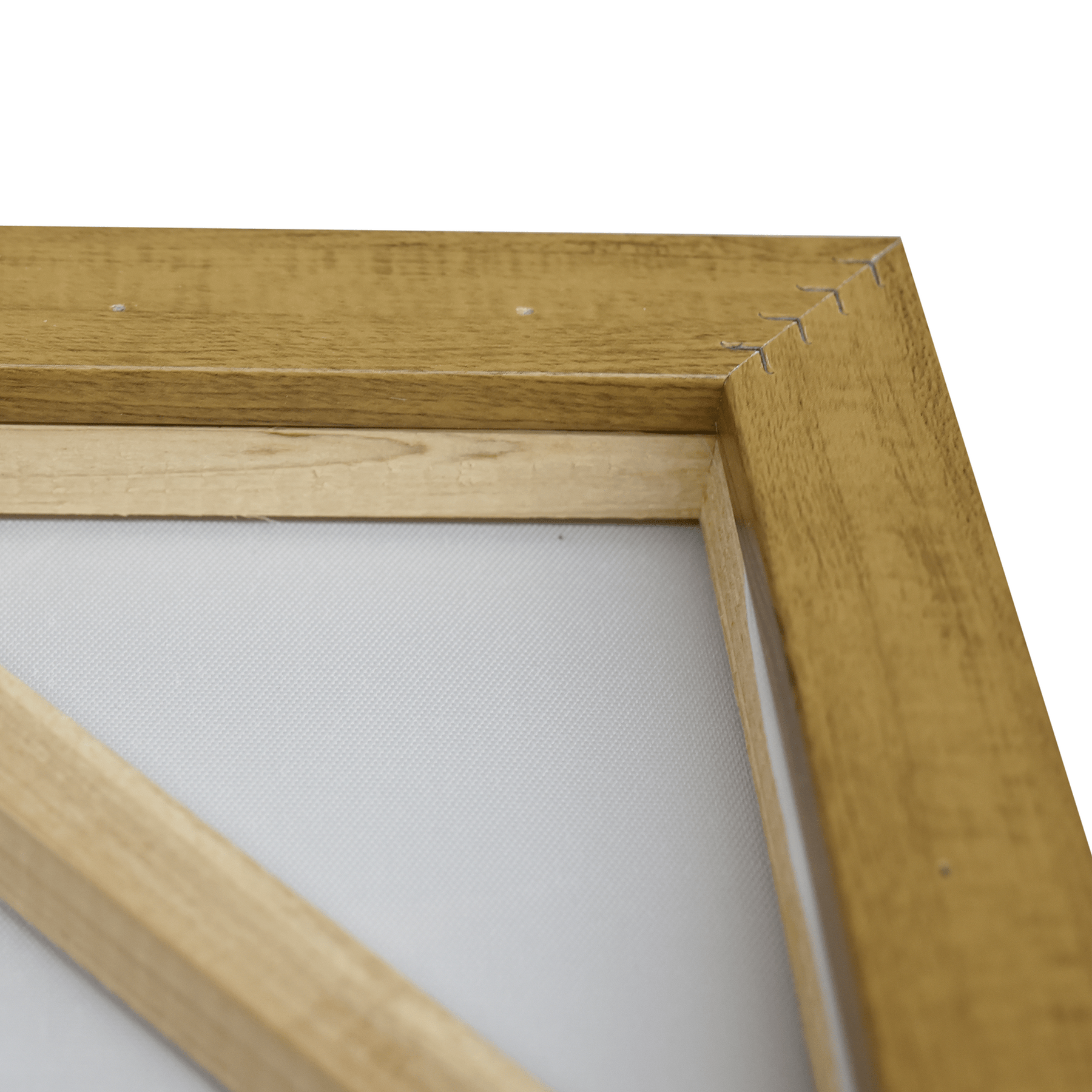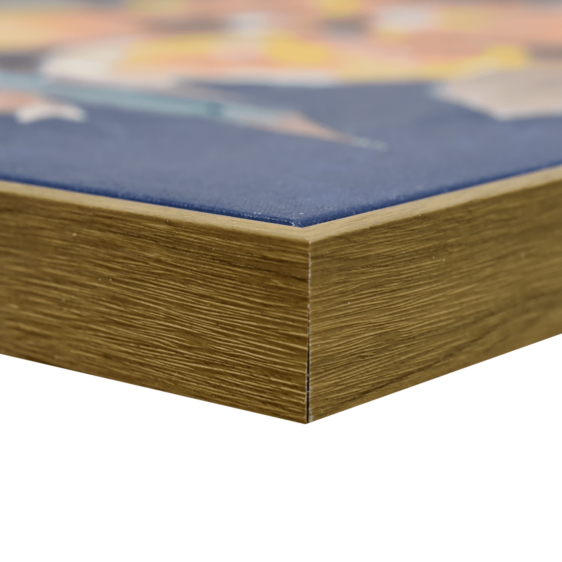 Stretched and gallery wrapped around a wooden stretcher and finished with a floating frame. There is a gap between the frame and print, which creates the floating effect and literally makes the canvas print stand out even more.