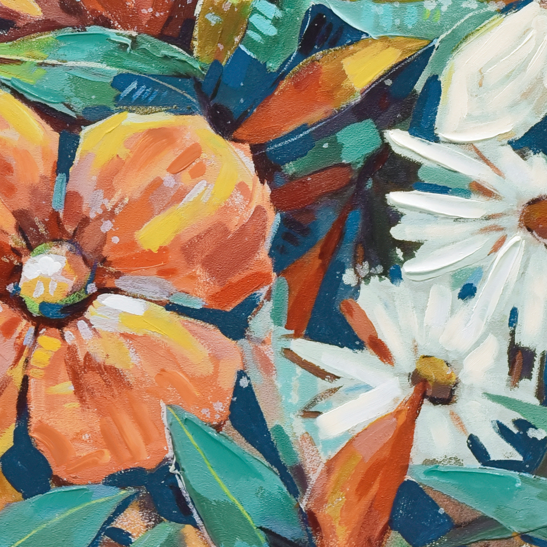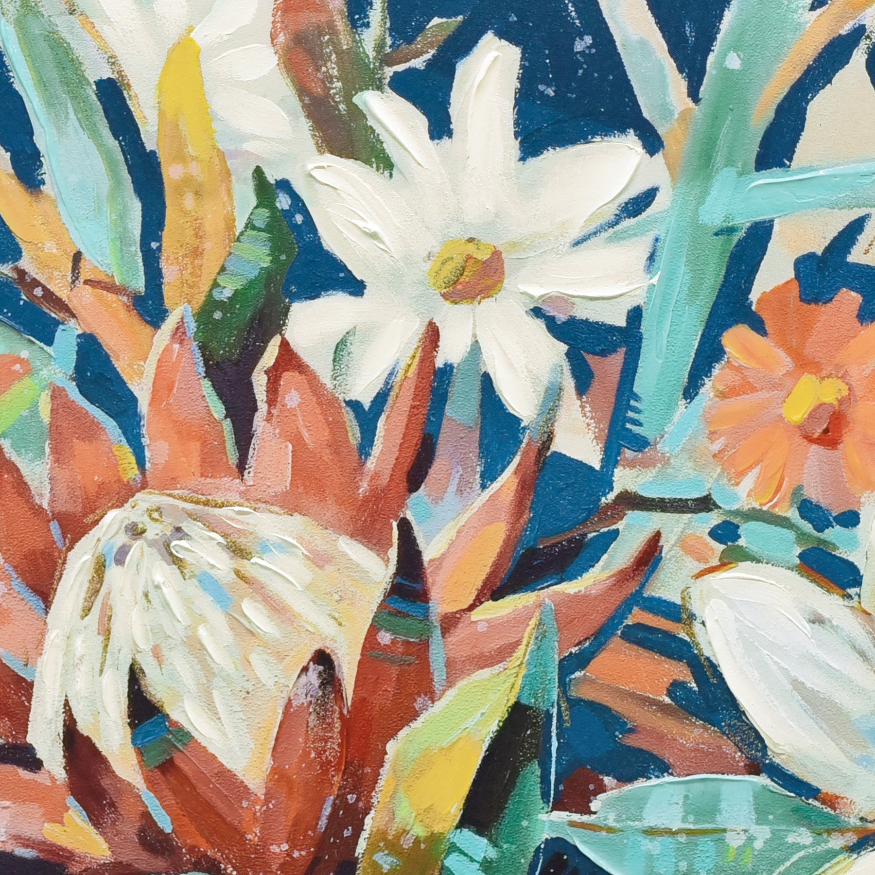"Austral Flora" is a captivating blend of traditional artistry and modern techniques, presenting a fusion of 50% hand-painted elements intertwined with printed details. The canvas is dominated by the striking presence of a protea flower, nestled amid a bouquet of kangaroo paw and dogwood flowers. The choice of monotone orange and white for the blooms offers a stark yet harmonious contrast against the vibrant cyan leaves and deep blue backdrop. The composition is beautifully framed within dark fir wood, further enhancing the depth and richness of the palette. This artwork is not merely a depiction of flora but a celebration of the beauty and diversity of Australian botany, rendered in an abstract style that beckons viewers to appreciate the details and immerse in its allure.