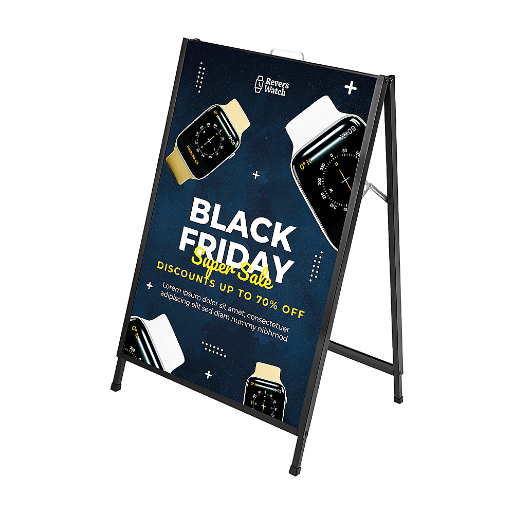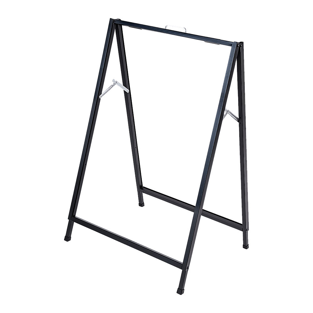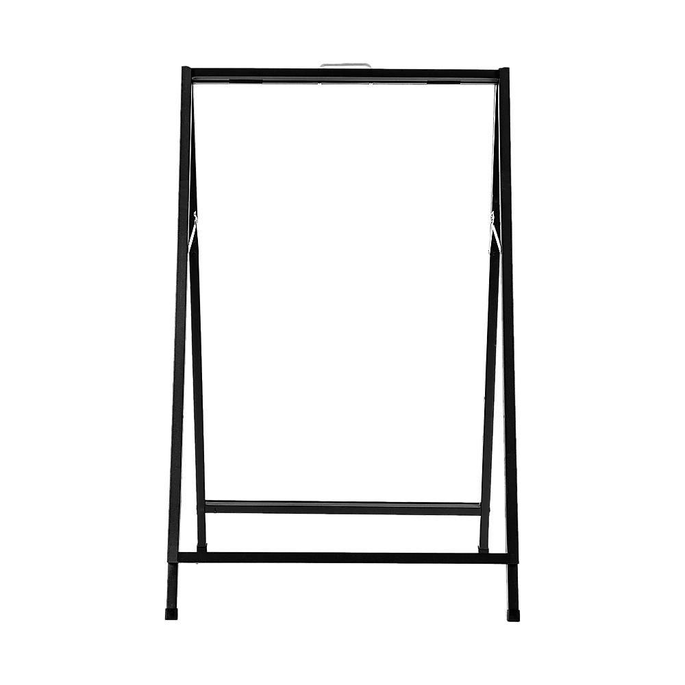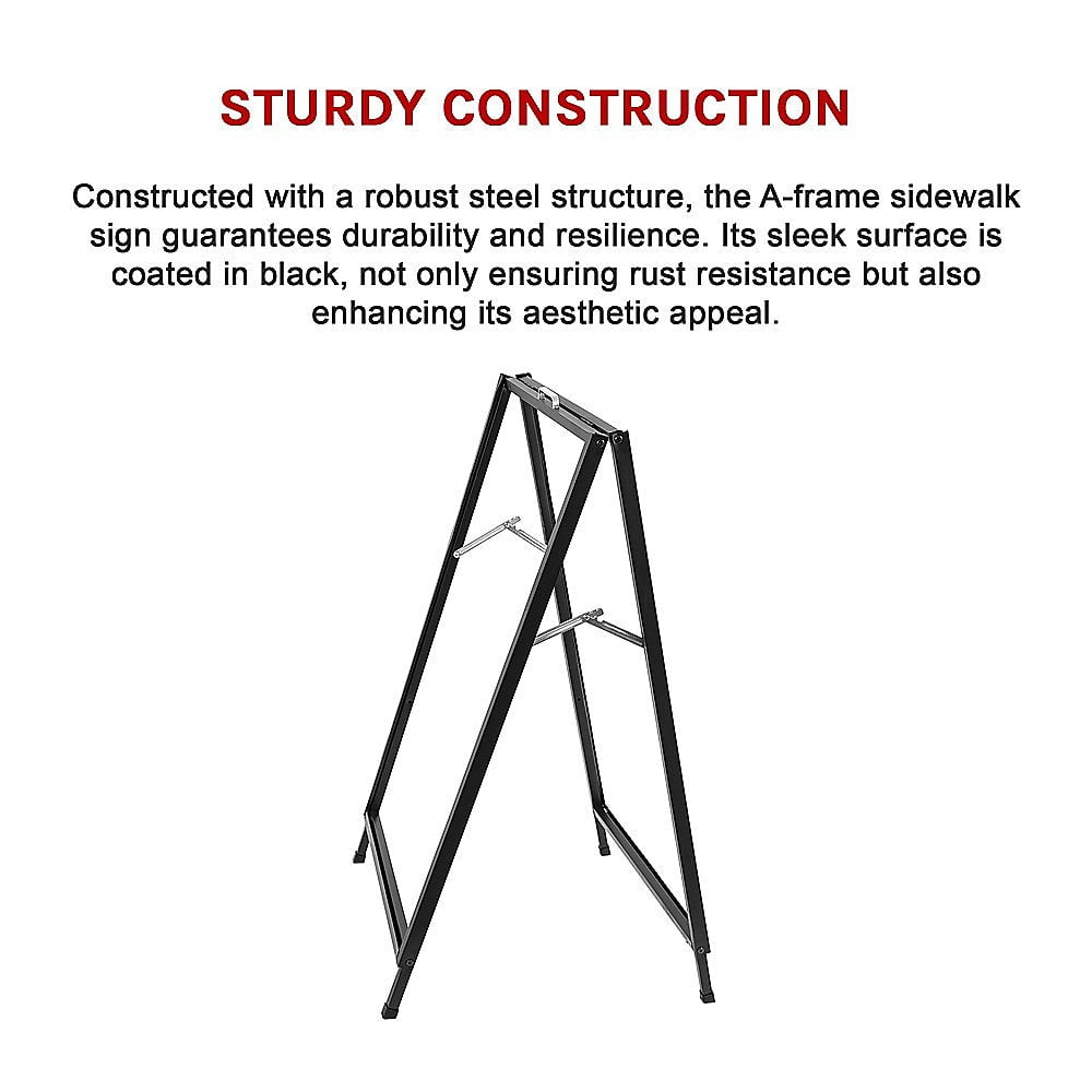 Constructed with a robust steel structure, the A-frame sidewalk sign guarantees durability and resilience. Its sleek surface is coated in black, not only ensuring rust resistance but also enhancing its aesthetic appeal. The A-frame configuration, coupled with anti-skid feet, ensures steadfast stability during use.