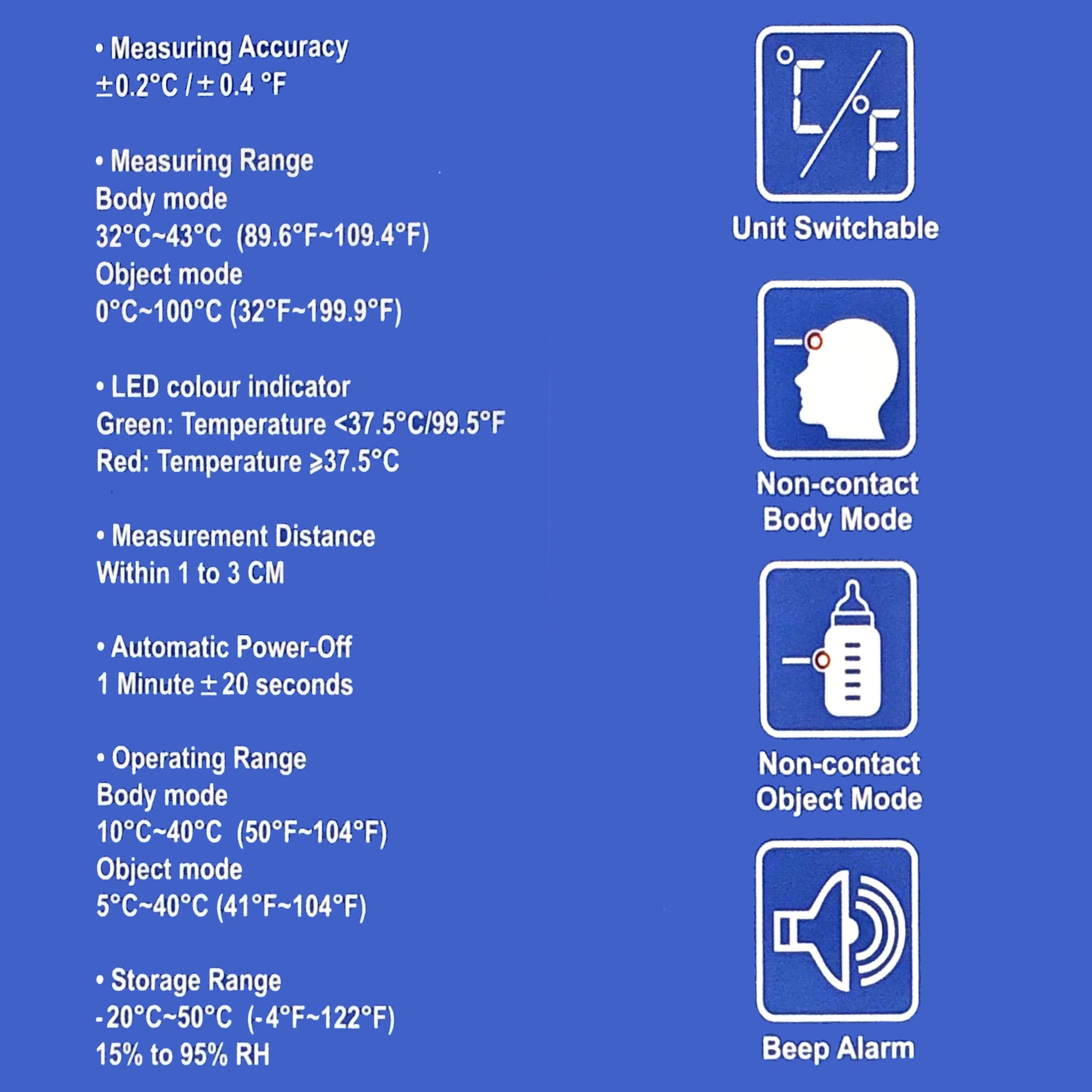 The measurement range is 1-3cm and within 1 second it will display the detected temperature with a +/- 0.2deg C (+/- 0.4deg F) measuring accuracy.