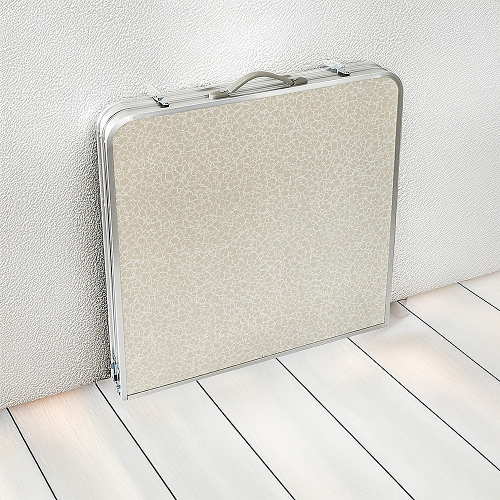 This folding table provides extra space for four guests but folds away neatly after the party's over. When folded up, its compact footprint takes up little space in your wardrobe or other storage spaces. A great gift for camping fans, young people in their first apartment, or families with young kids or a great accessory for those who love entertaining, this table is something you won't want to do without. Get yours today!