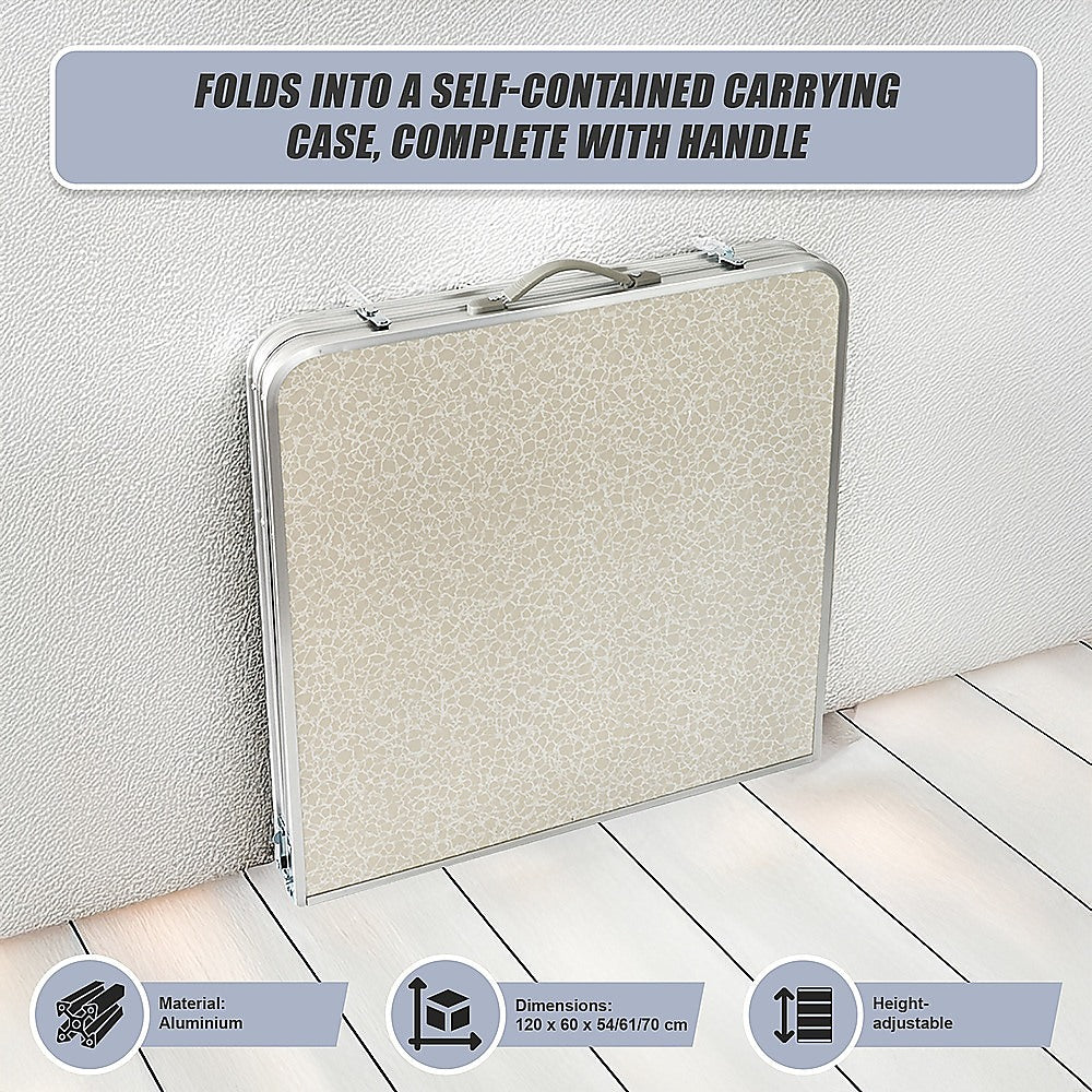 Getting ready to enjoy summer picnics at the park or impromptu beach seafood feasts? Don't forget to take along this easy-store portable folding table by Randy Travis Machinery. Perfect for camping trips or as an extra table for holiday get-togethers, this table is a summertime accessory you won't want to be without. It comes with an attached handle and folds up into an easy-carry, easy-store carrying case. Its light weight makes it an excellent choice for travelling, yet its more than 9kg weight capacity can hold a wide variety of foods.