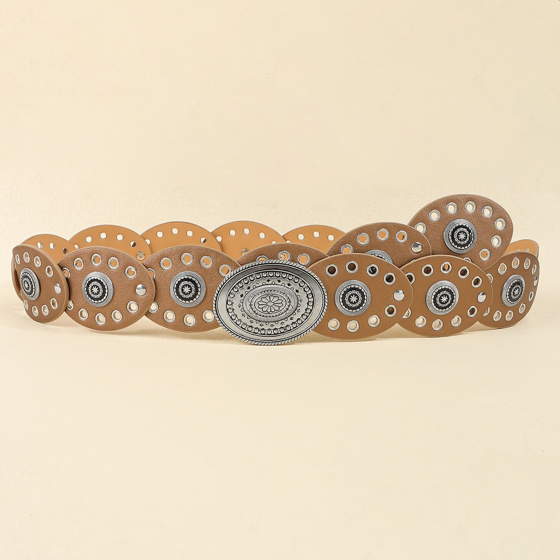 Elevate your wardrobe with this Vintage Western Post-Apocalyptic Women's Waist Belt, a striking fusion of rugged elegance and bold design. Crafted to accentuate your silhouette, this waist cincher features intricate oval carvings and metallic eyelets, adding a distinctive retro dystopian flair. Perfect for pairing with dresses, jeans, or oversized shirts, this belt effortlessly blends vintage Western charm with a modern edge, making it an essential accessory for any fashion-forward individual.