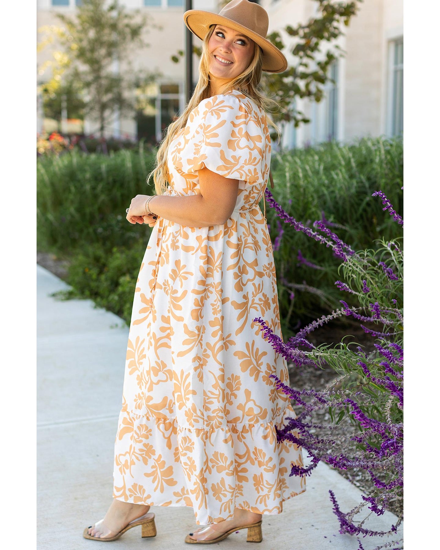 Apricot Floral Print Puff Short Sleeve Resort Plus Size Maxi Dress - 1X