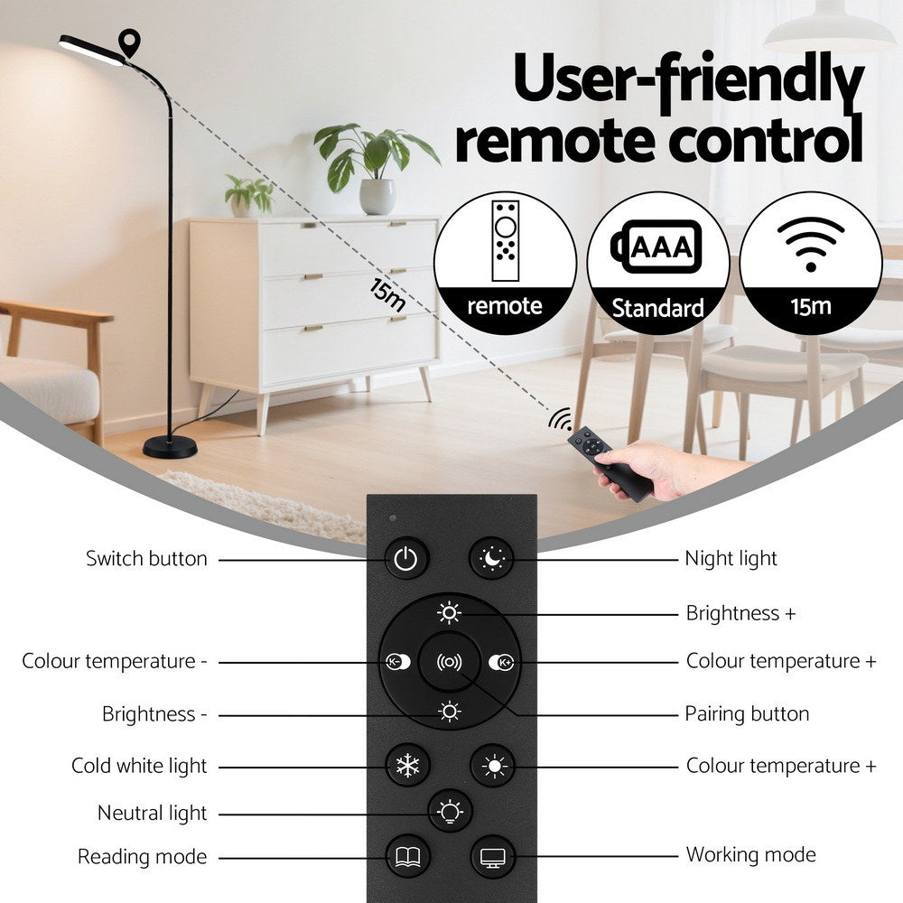 Illuminate your space with the Artiss LED Floor Lamp. This lamp blends a sleek, modern design with powerful functionality, allowing you to create the perfect lighting ambience in any room. Effortlessly customise your light with stepless brightness and multiple colour temperatures to suit any task, whether you're focused on reading, relaxing, or spending time with family. The ultra-flexible 360~ gooseneck lets you precisely direct the light exactly where you need it, while the user-friendly remote control offers wireless convenience from up to 15 metres away. Powered by a reliable SAA adaptor, this energy-efficient and eye-caring lamp provides consistent, flicker-free light all day long. A stable base ensures the lamp remains secure, making it the perfect addition to your home office, living room, or bedroom.