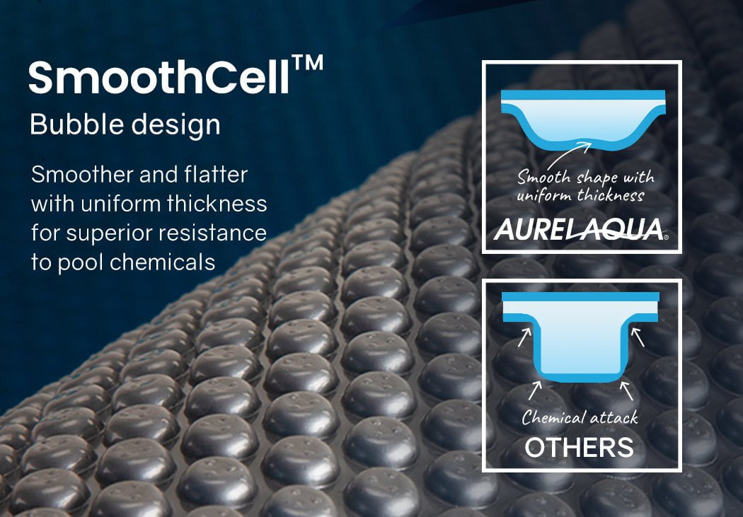 The exclusive Aurelaqua Solar Swimming Pool Cover features an exclusive bubble design with a smooth and flat shape without any sharp curves that are prone to being thin weak points. These thinner sections in other pool blankets are more susceptible to damage by pool chemicals and general wear and tear.