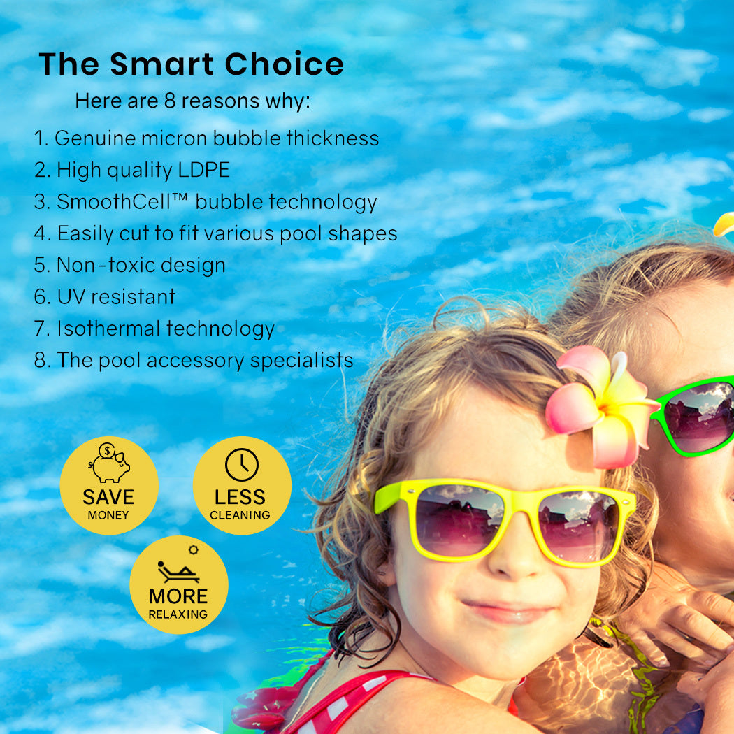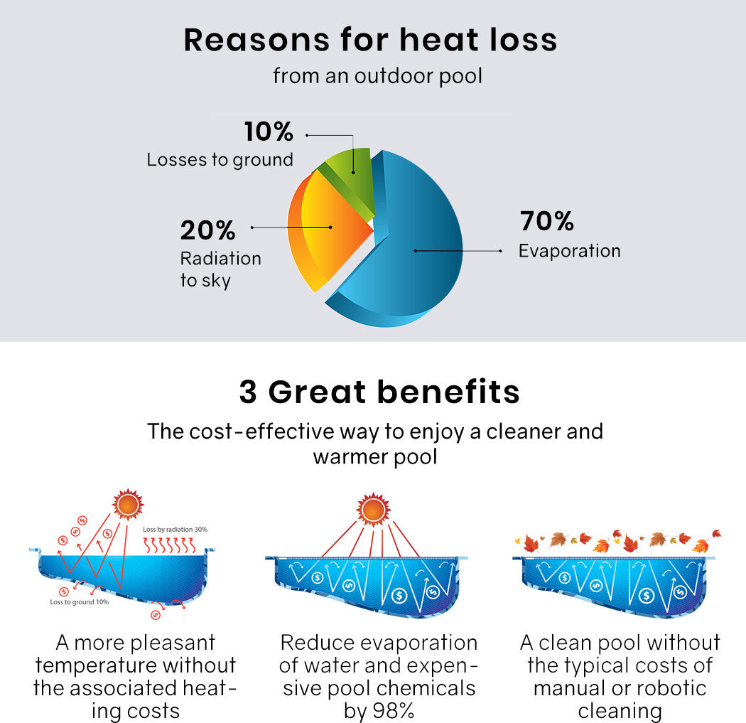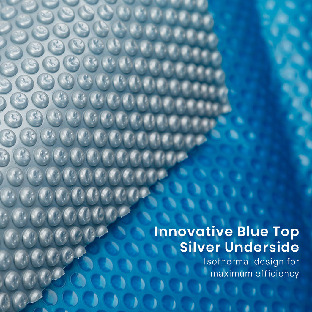 The innovative split blue and silver isothermal design fulfils unique benefits for your pool. While the sun is shining, the translucent blue rippled surface allows for greater heat to easily pass through, magnified by the bubbles to naturally heat the water. The silver underside then acts to trap the heat underneath and retain the pool's warmth for longer periods of time, which means swimming seasons extend further into the year.