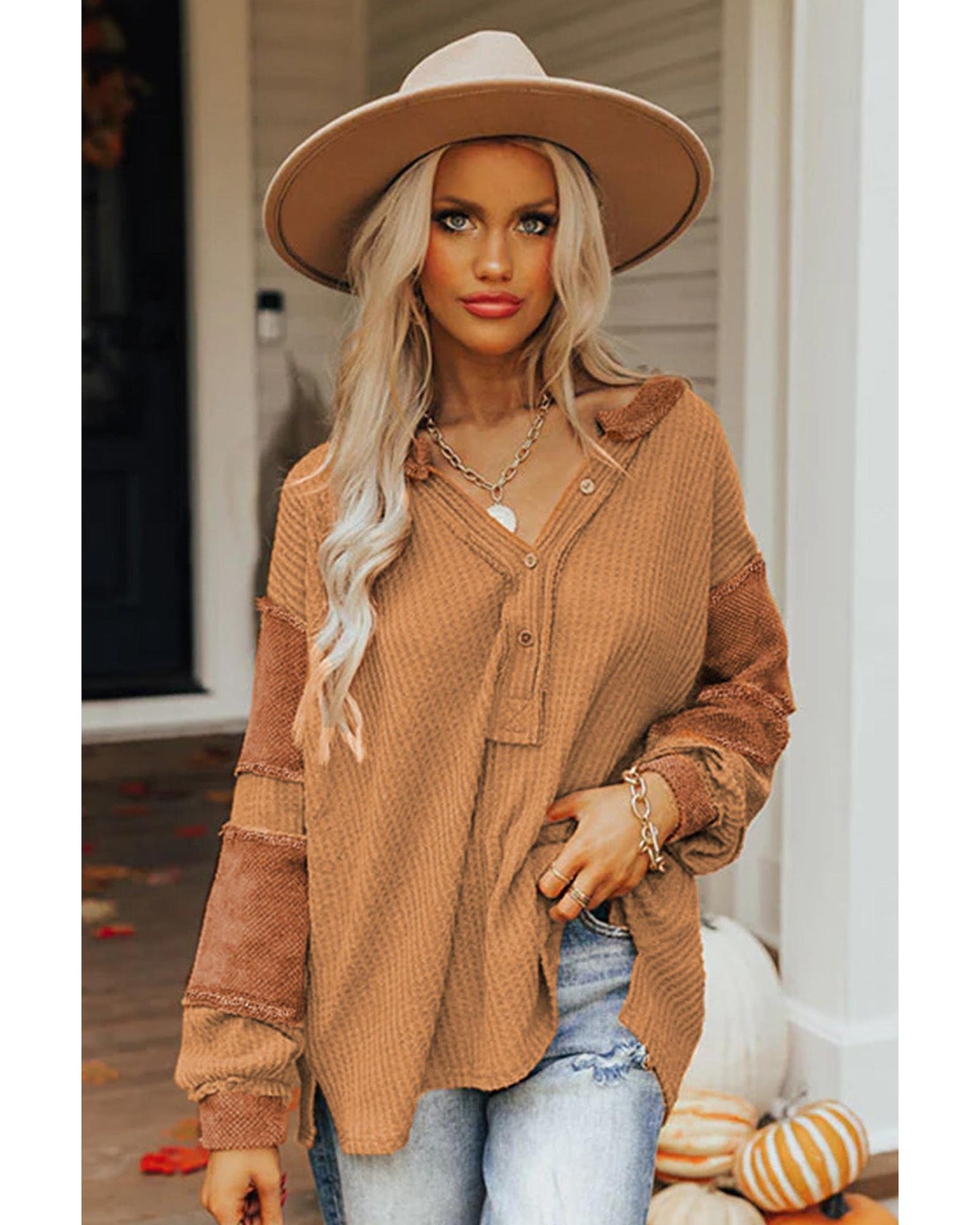 • Stylish and versatile Orange Contrast Patched Exposed Seam Waffle Knit Henley Top