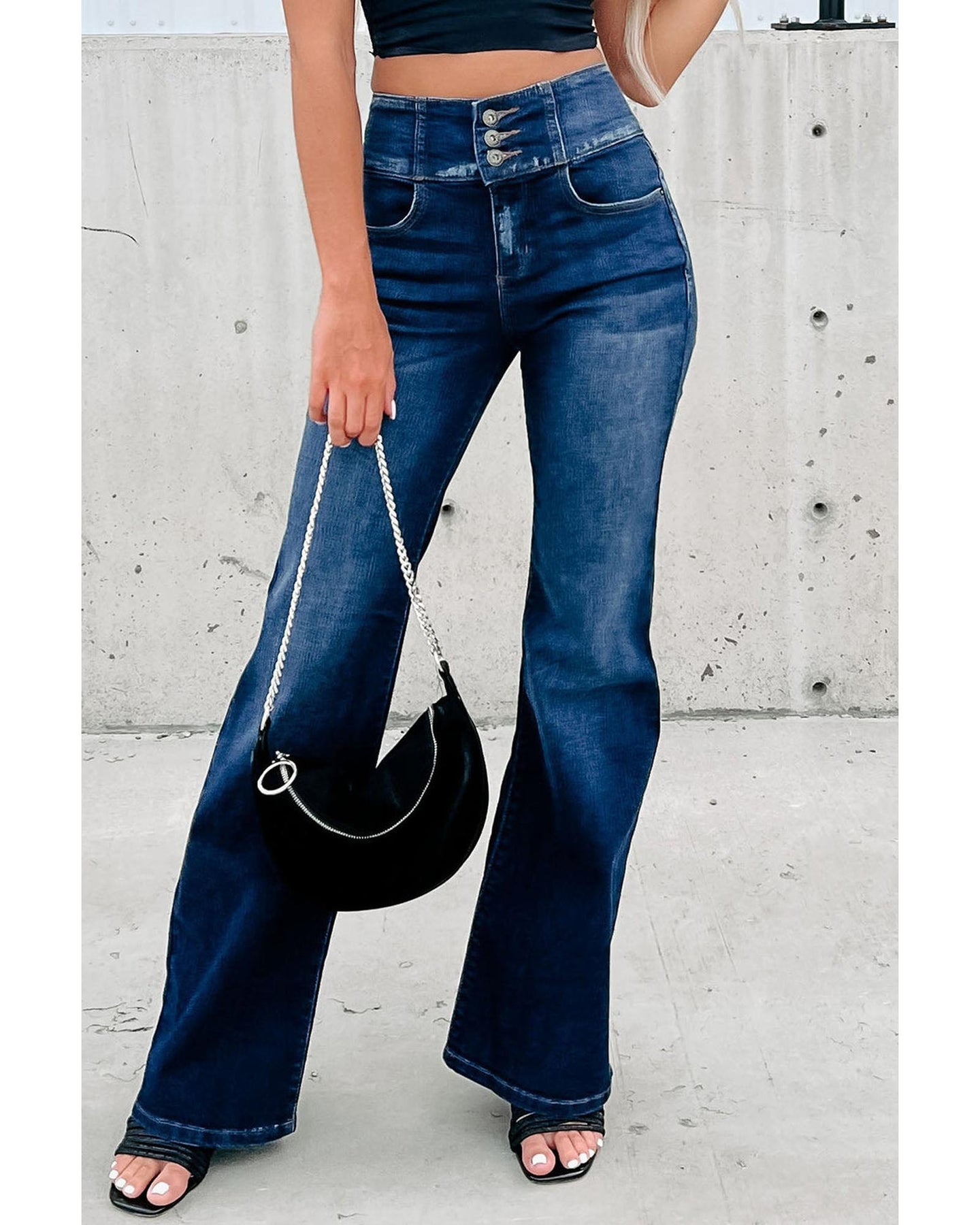 - Womens Buttons Elastic Wide Waistband Back Flare Jeans