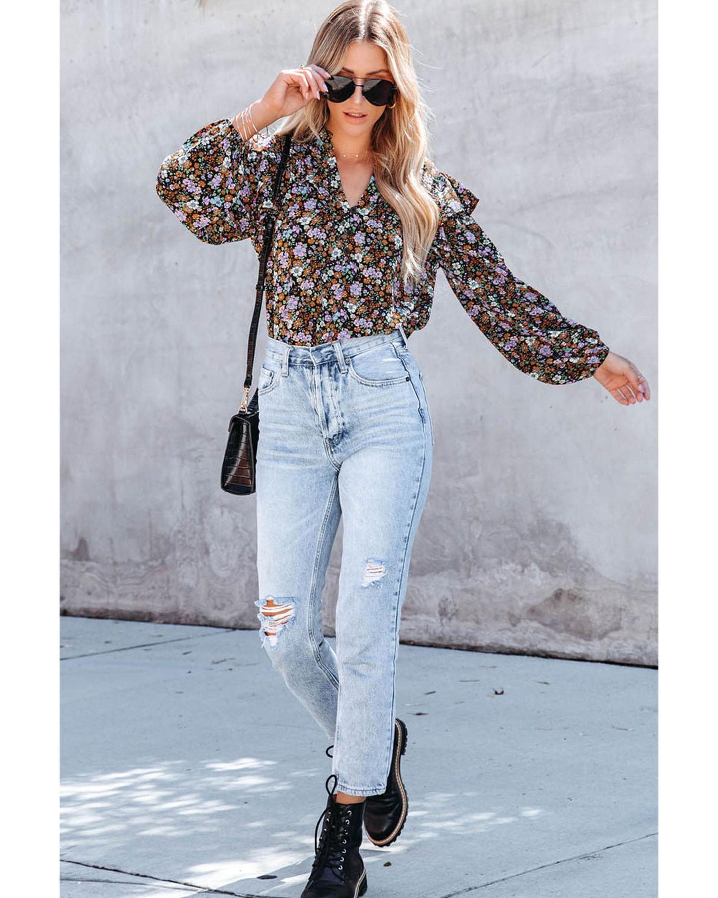 Azura Exchange Floral Print Ruffled Bubble Sleeve Shirt - XL