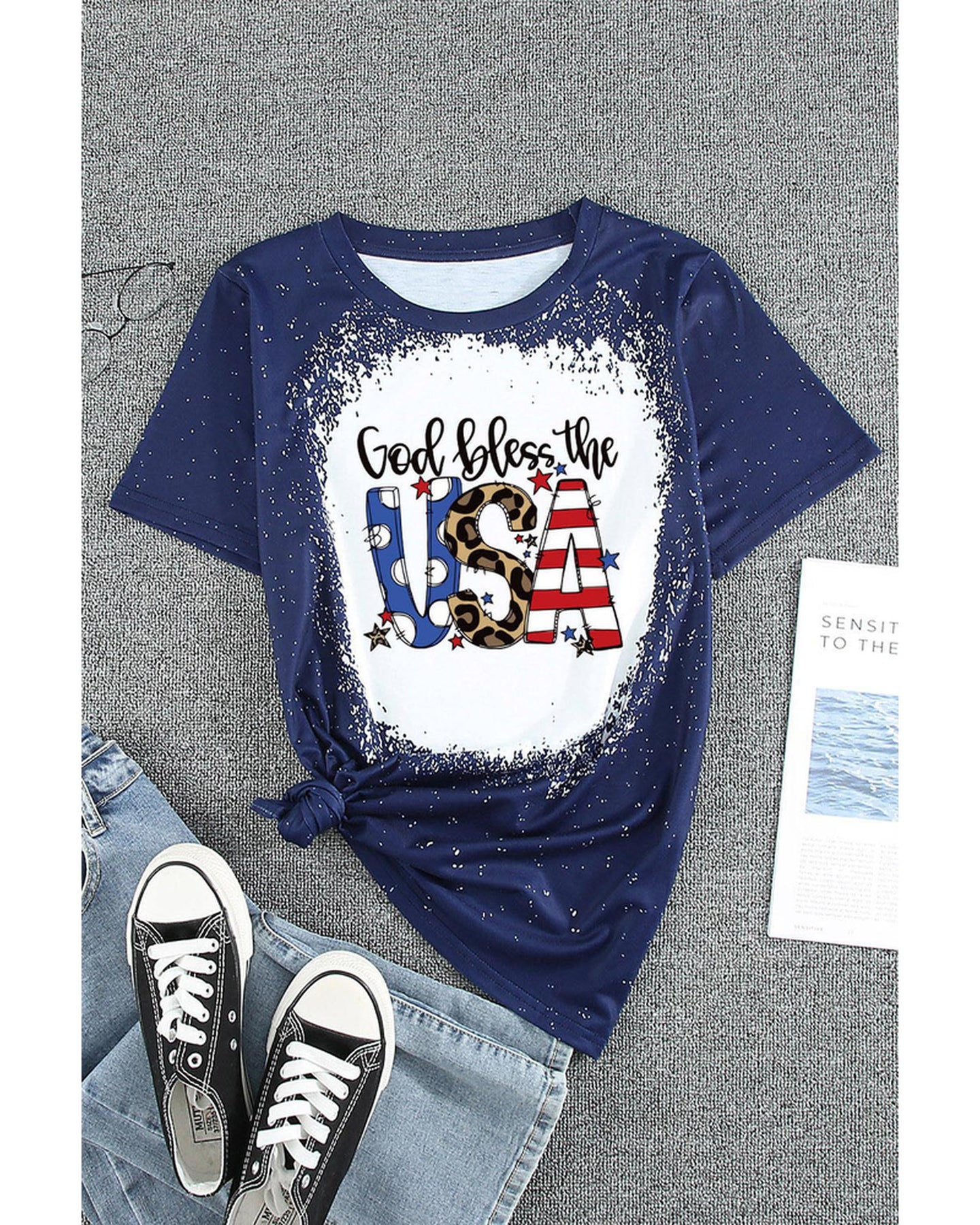 - Eye-catching bleach print with the phrase God Bless the USA