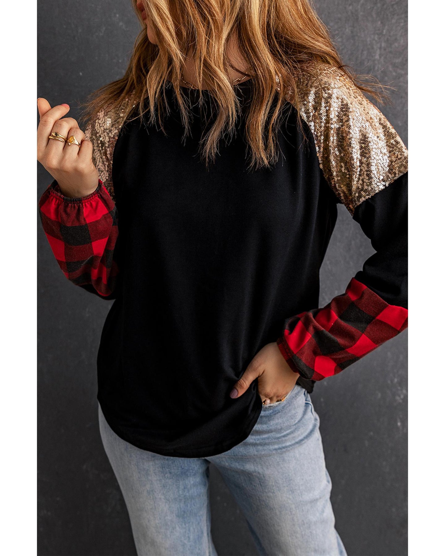 - Stylish and trendy Crewneck Lantern Sleeve Plaid Sequin Splicing Pullover Sweatshirt