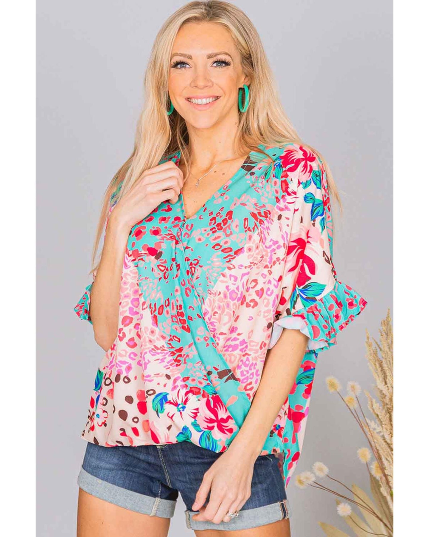- Trendy and stylish Multicolor Leopard Floral Mixed Print Ruffle Sleeve Surplice Blouse