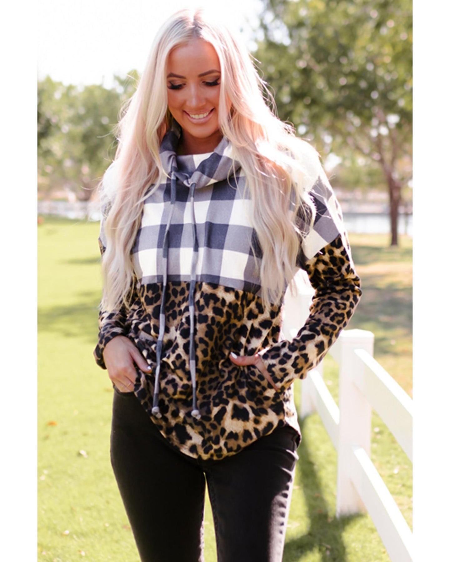 - Stylish and cozy Plaid Patchwork Cowl Neck Sweatshirt