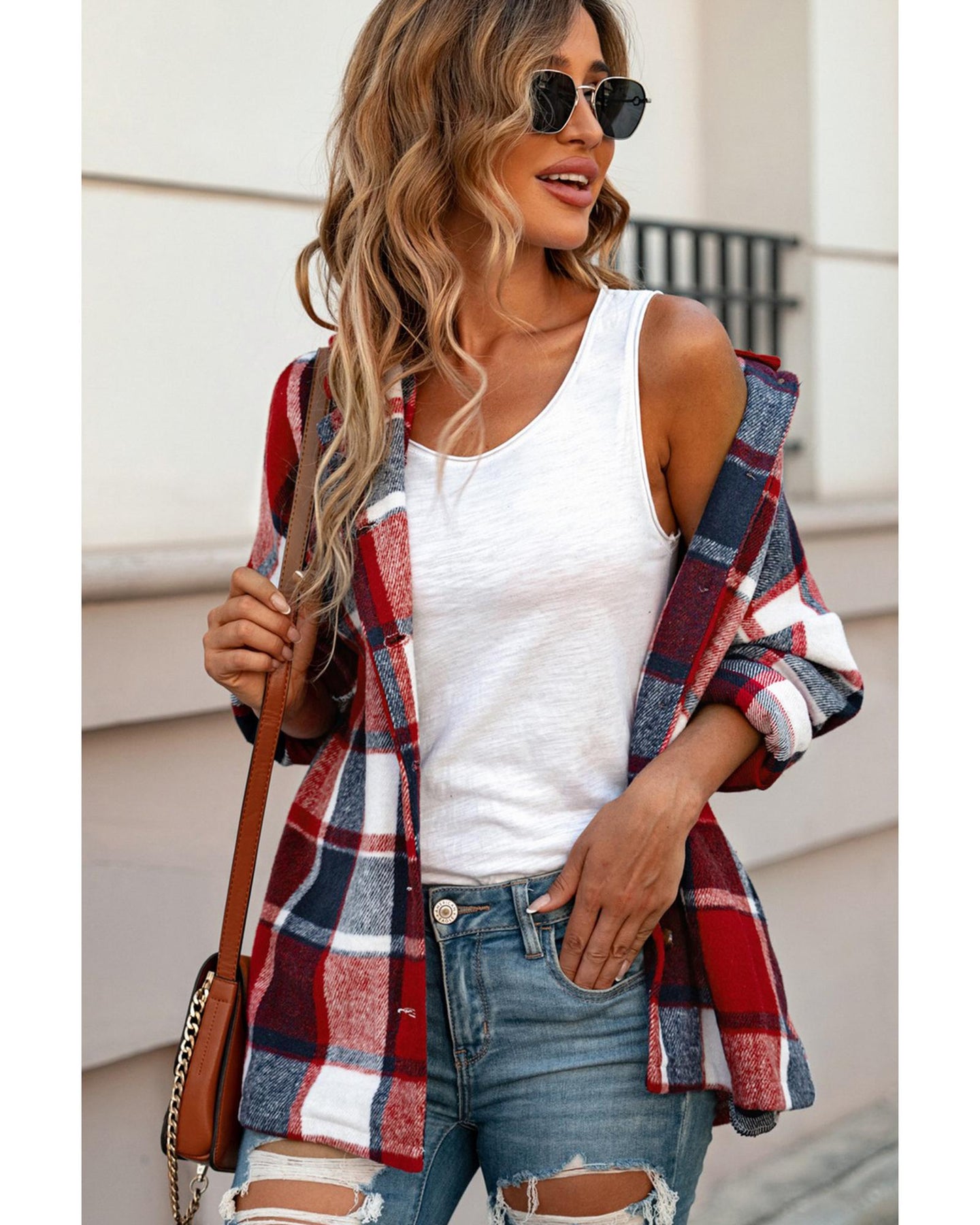 Azura Exchange Red Hooded Plaid Button Front Shacket - S