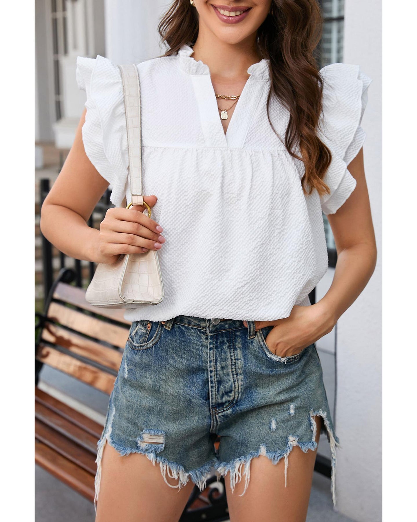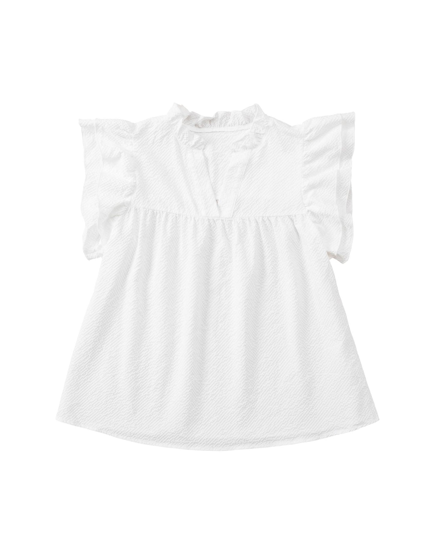 - Flutter sleeves with ruffle accents