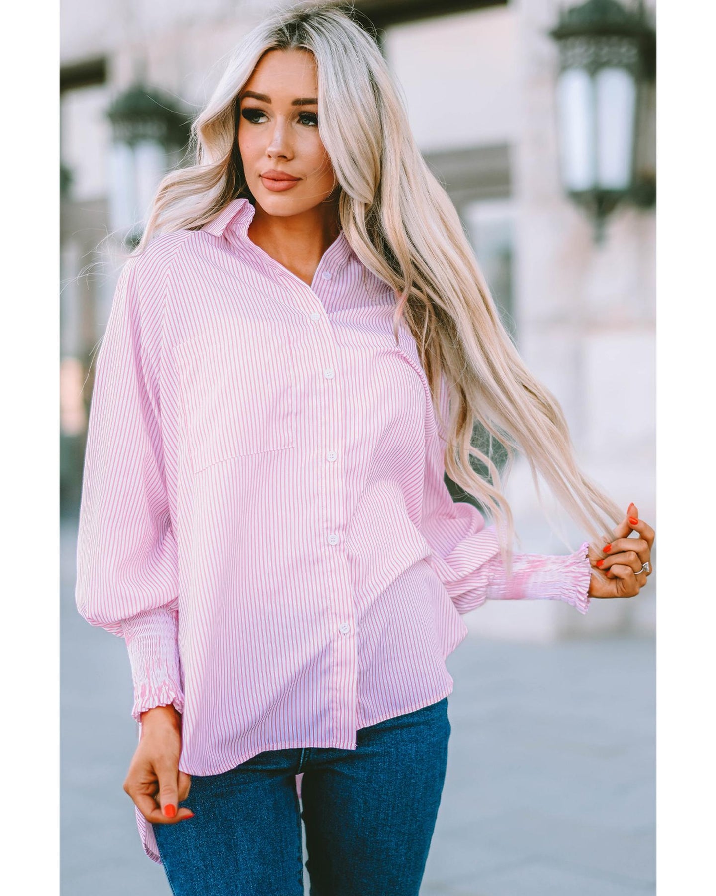 • Versatile and stylish Smocked Cuffed Striped Boyfriend Shirt with Pocket
