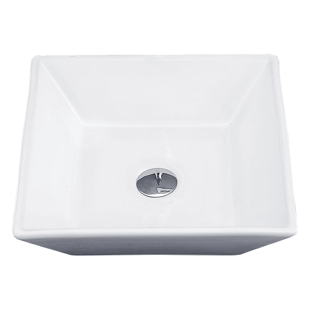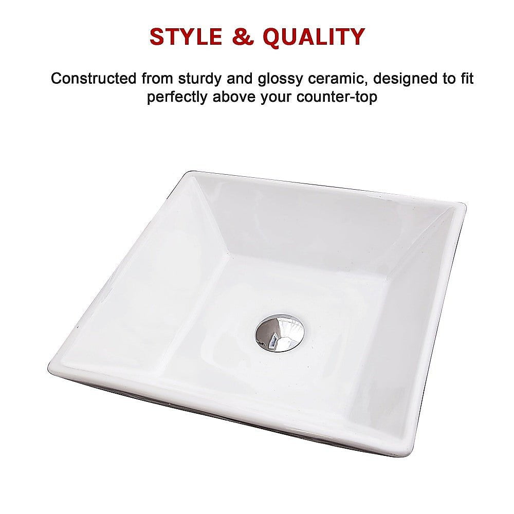 This attractive above-the counter basin is made from a ceramic construction. The basin is rectangular in shape and measures 415mm x 415mm x 120 mm.