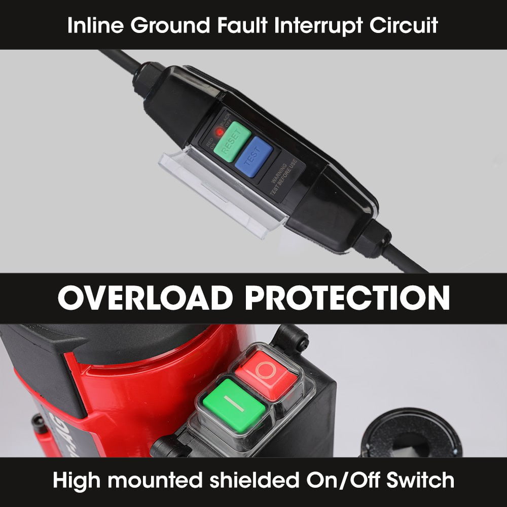 Designed to provide the ultimate user experience, this wet-core drilling machine has a range of thoughtful features. The non-slip handle ensures a secure grip, allowing for precise control and reducing fatigue during extended usage. The inline circuit interrupt switch has an overload protector preventing motor damage. The on/off switch is chassis mounted which adds an extra layer of safety. The double insulation on the motor provides machine and operator protection, ensuring the utmost safety for the operator.